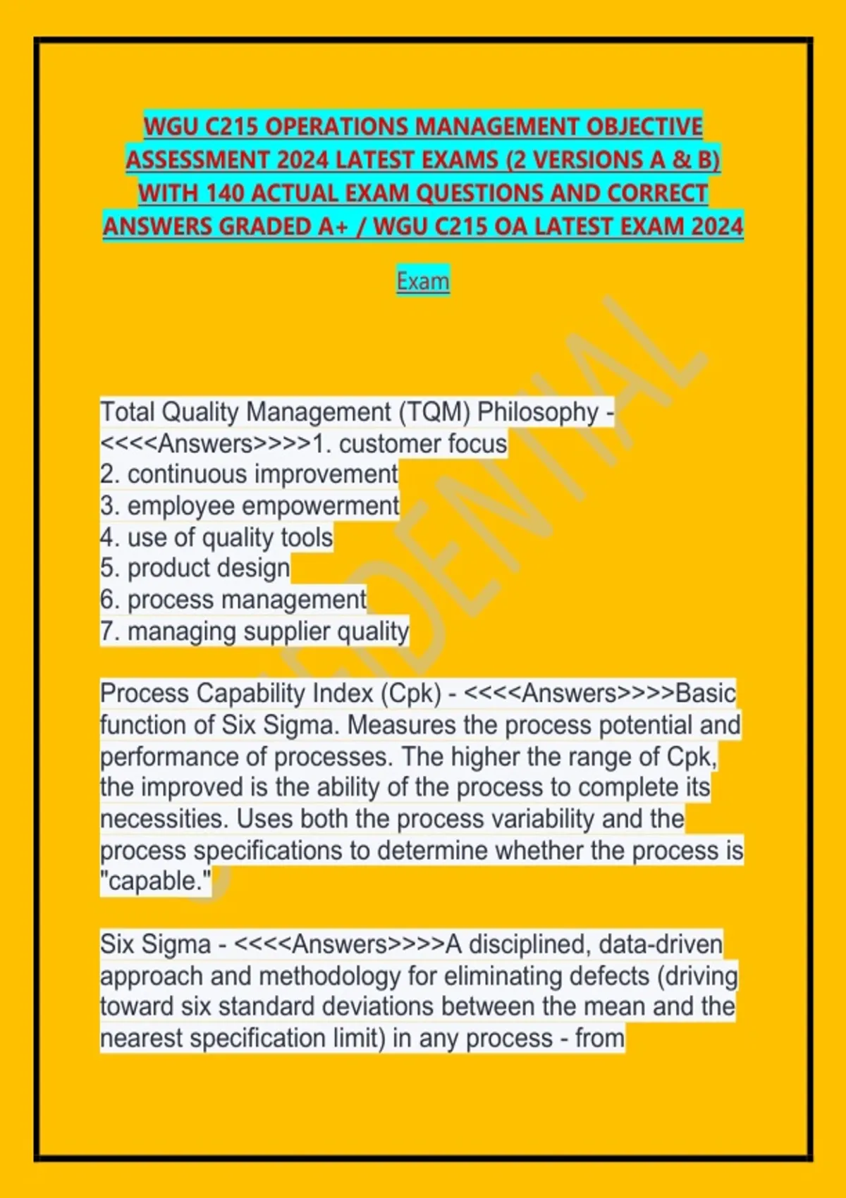WGU C215 OPERATIONS MANAGEMENT OBJECTIVE ASSESSMENT 2024 LATEST EXAMS (2 VERSIONS A & B) WITH 140 ACTUAL EXAM QUESTIONS AND CORRECT ANSWERS GRADED A+ / WGU C215 OA LATEST EXAM 2024 Exam