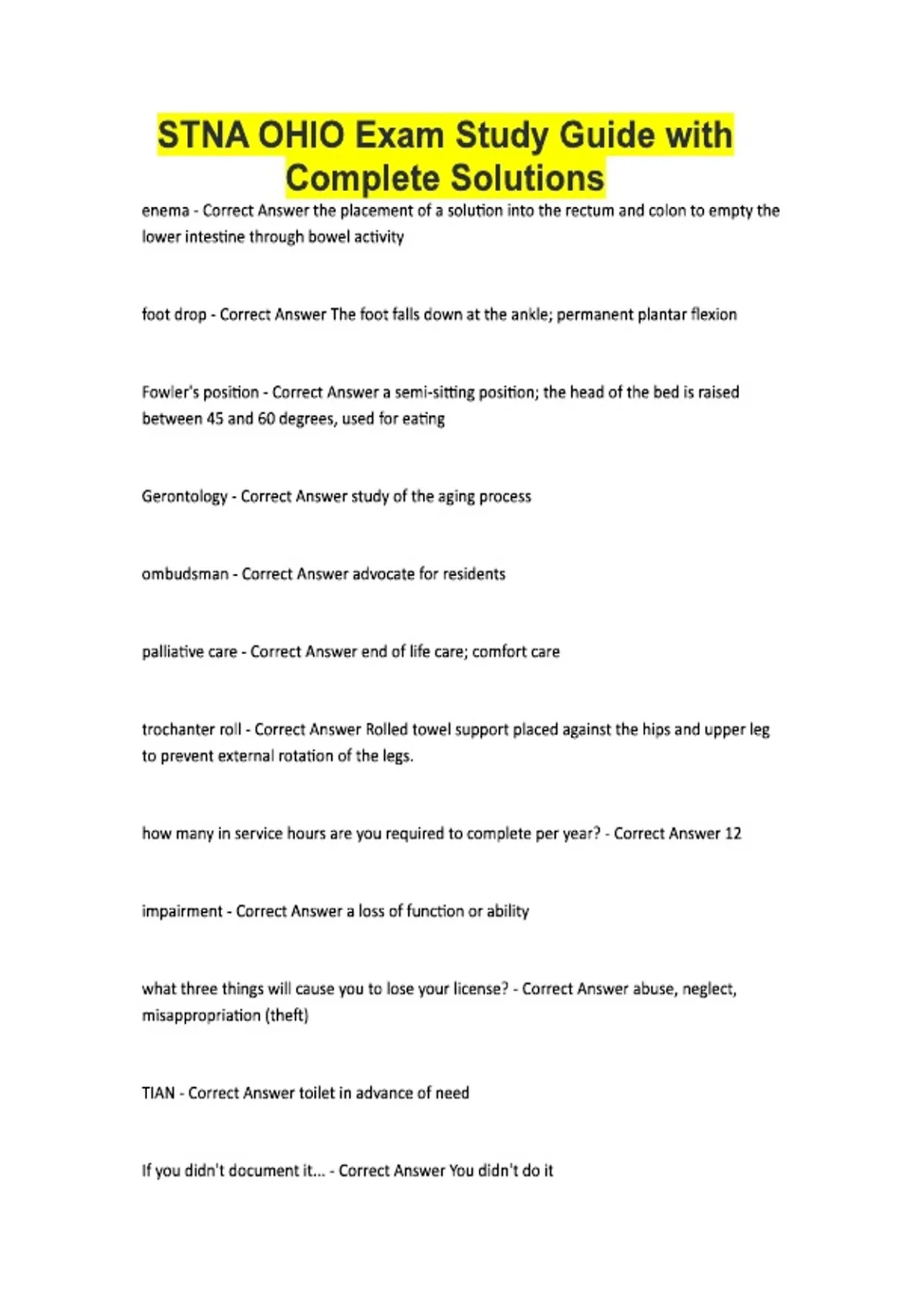 STNA OHIO Exam Study Guide with Complete Solutions enema - Correct Answer the placement of a solution into the rectum and colon to empty the lower intestine through bowel activity foot drop - Correct Answer The foot falls down at the ankle; permanent plantar flexion Fowler's position - Correct Answer a semi-sitting position; the head of the bed is raised between 45 and 60 degrees, used for eating Gerontology - Correct Answer study of the aging process ombudsman - Correct Answer advocate for residents palliative care - Correct Answer end of life care; comfort care trochanter roll - Correct Answer Rolled towel support placed against the hips and upper leg to prevent external rotation of the legs. how many in service hours are you required to complete per year? - Correct Answer 12 impairment - Correct Answer a loss of function or ability what three things will cause you to lose your license? - Correct Answer abuse, neglect, misappropriation (theft) TIAN - Correct Answer toilet in advance of need If you didn't document it... - Correct Answer You didn't do it what sh