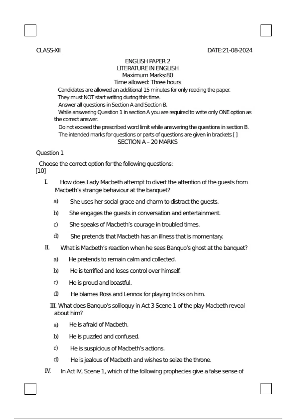 This document contains English Literature test papers based on Macbeth, Rhapsody, and Prism. The questions are designed to test students’ understanding of themes, characters, literary devices, and critical analysis. It includes a mix of short answer questions, long answer questions, and extract-based questions, making it useful for exam preparation, revision, and practice tests. These test papers are suitable for secondary/high school students studying English Literature and can also be used by teachers for assessment or classroom practice.