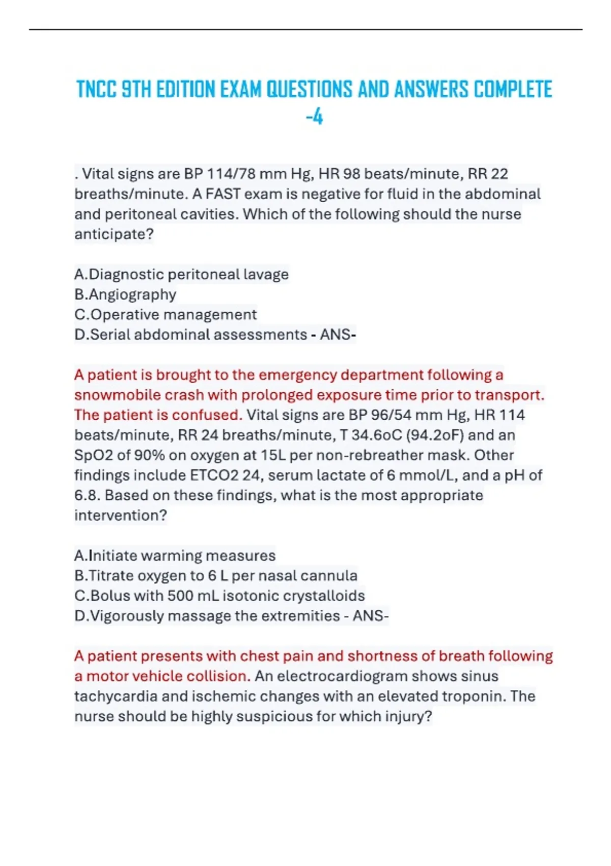 This comprehensive TNCC 9th Edition Exam Questions and Answers PDF is a complete and updated study resource for nurses preparing for the Trauma Nursing Core Course (TNCC) certification in 2026. The document features high-quality exam-style questions with correct and verified answers, aligned with the official TNCC 9th Edition curriculum. Key topics covered include primary and secondary trauma assessment, shock management, head and spinal injuries, thoracic and abdominal trauma, musculoskeletal injuries, burns, pediatric and geriatric trauma care, trauma team roles, and emergency nursing priorities. This resource is ideal for emergency nurses, trauma nurses, nursing students, and healthcare professionals seeking focused exam preparation, quick revision, and confidence building. The question format mirrors real TNCC exam scenarios, making it suitable for both self-study and group review. Whether you are sitting for the TNCC exam for the first time or completing a refresher course, this TNCC 9th Edition Complete Review for 2026 provides a reliable, exam-focused study aid designed to support success.
