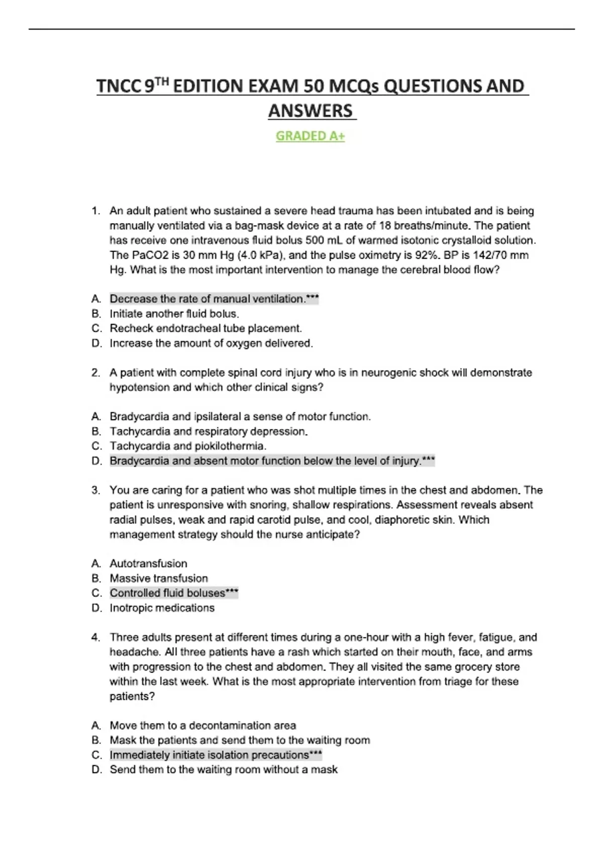 This TNCC 9th Edition 50 MCQs Exam Questions and Answers PDF (2026) is a focused practice resource designed for nurses preparing for the Trauma Nursing Core Course (TNCC) certification. The document contains 50 carefully selected multiple-choice questions (MCQs) with correct and verified answers, aligned with the official TNCC 9th Edition curriculum and exam format. The questions cover essential trauma nursing topics including primary and secondary survey, shock and hemorrhage management, head and spinal injuries, thoracic and abdominal trauma, musculoskeletal injuries, burns, pediatric and geriatric trauma care, trauma team roles, and emergency nursing priorities. Ideal for emergency nurses, trauma nurses, critical care nurses, and nursing students, this resource supports quick revision, exam readiness, and self-assessment. The MCQ format mirrors real TNCC exam questions, making it perfect for practice testing, last-minute review, and confidence building. A reliable TNCC 9th Edition 50 MCQs practice exam for 2026, suitable for both first-time candidates and refresher learners.