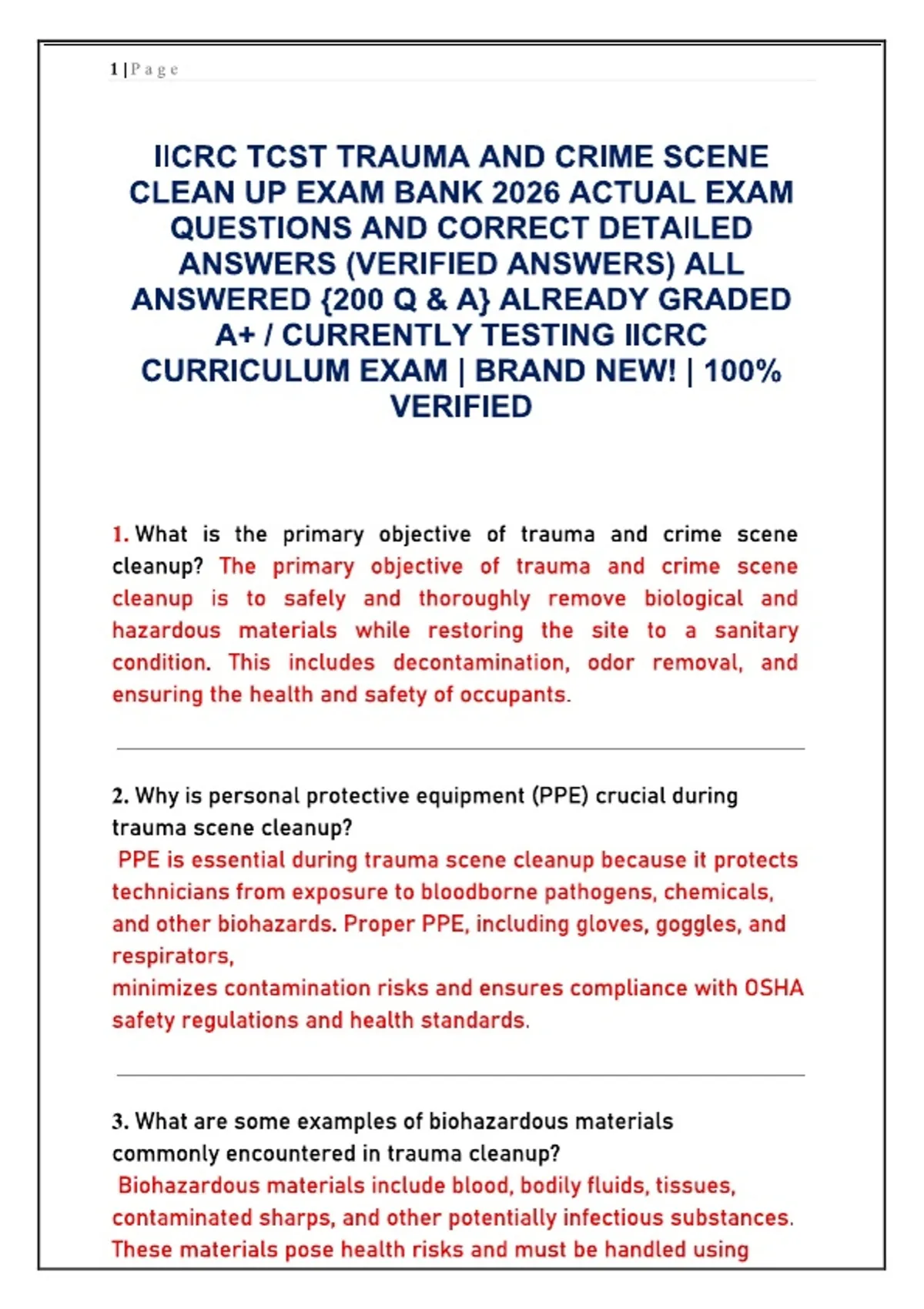 This IICRC TCST Trauma and Crime Scene Cleanup Exam Questions and Answers PDF (2026) is a comprehensive study and practice resource for professionals preparing for the IICRC TCST (Trauma and Crime Scene Cleanup Technician) certification exam. The document includes exam-style questions with correct and verified answers, structured to reflect the official IICRC TCST exam format and standards. The content covers essential TCST topics such as biohazard remediation, bloodborne pathogens, personal protective equipment (PPE), OSHA regulations, contamination control, cleaning and disinfection procedures, waste handling and disposal, legal and ethical considerations, and scene safety protocols. Designed for restoration professionals, biohazard cleanup technicians, contractors, and certification candidates, this resource supports effective exam preparation, knowledge reinforcement, and confidence building. The question format mirrors real exam scenarios, making it ideal for practice testing, self-study, and last-minute review. A reliable IICRC TCST exam preparation resource for 2026, suitable for both first-time candidates and refresher learners.