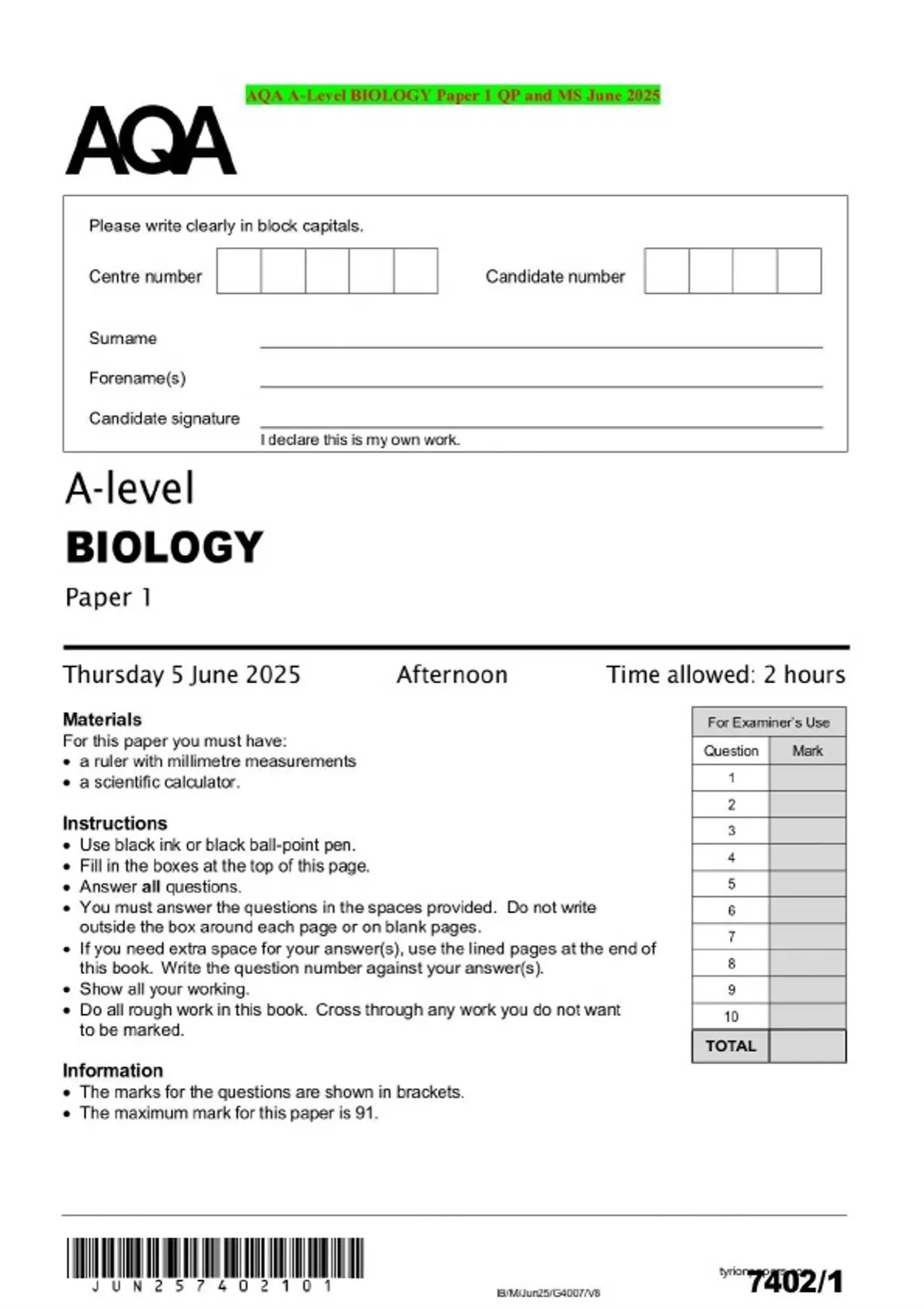 AQA A-Level BIOLOGY Paper 1 QP and MS June 2025
