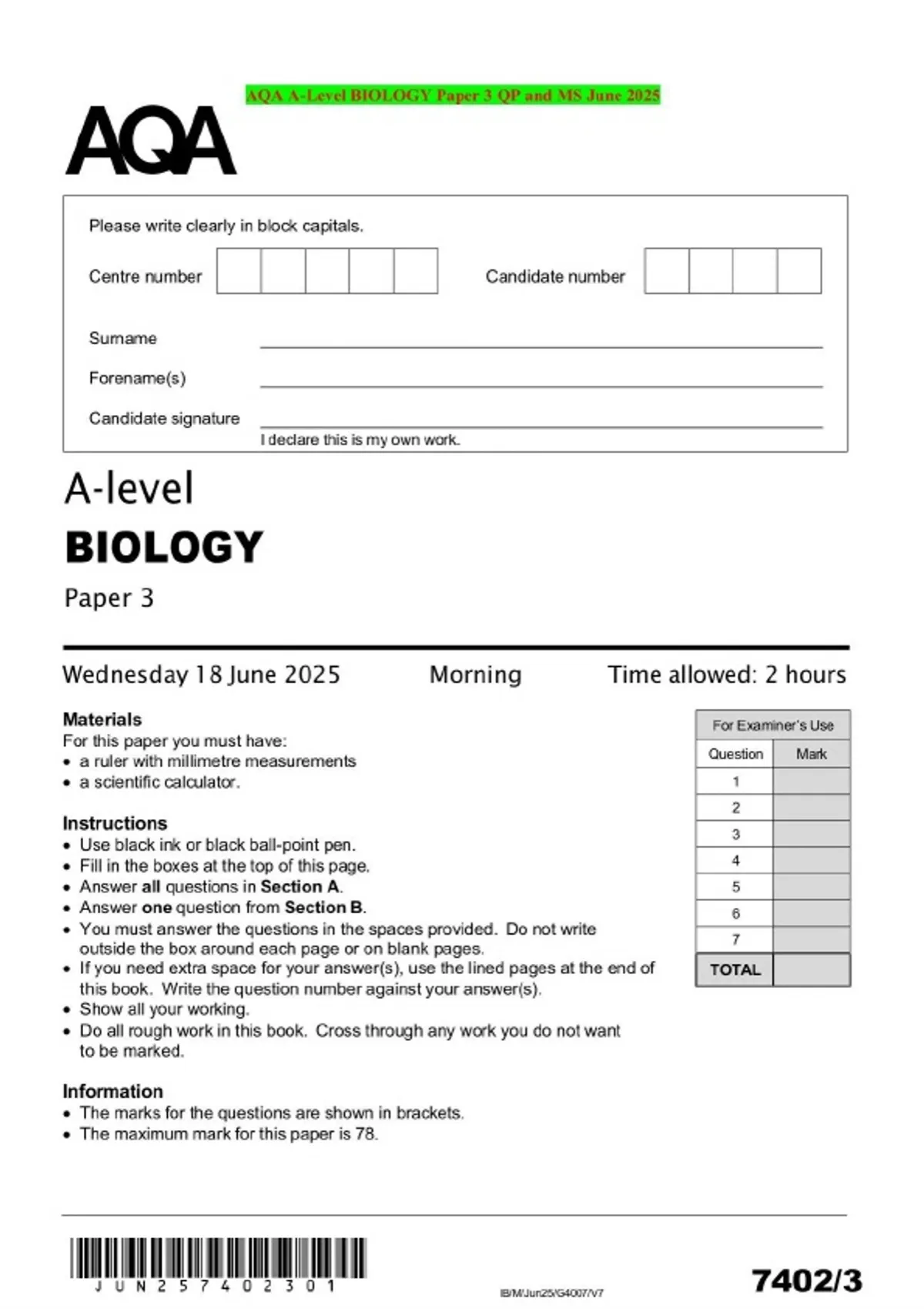 AQA A-Level BIOLOGY Paper 3 QP and MS June 2025