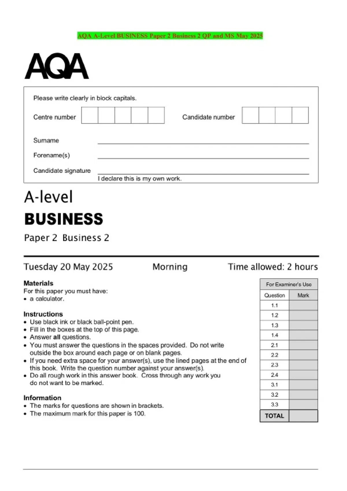AQA A-Level BUSINESS Paper 2 Business 2 QP and MS May 2025