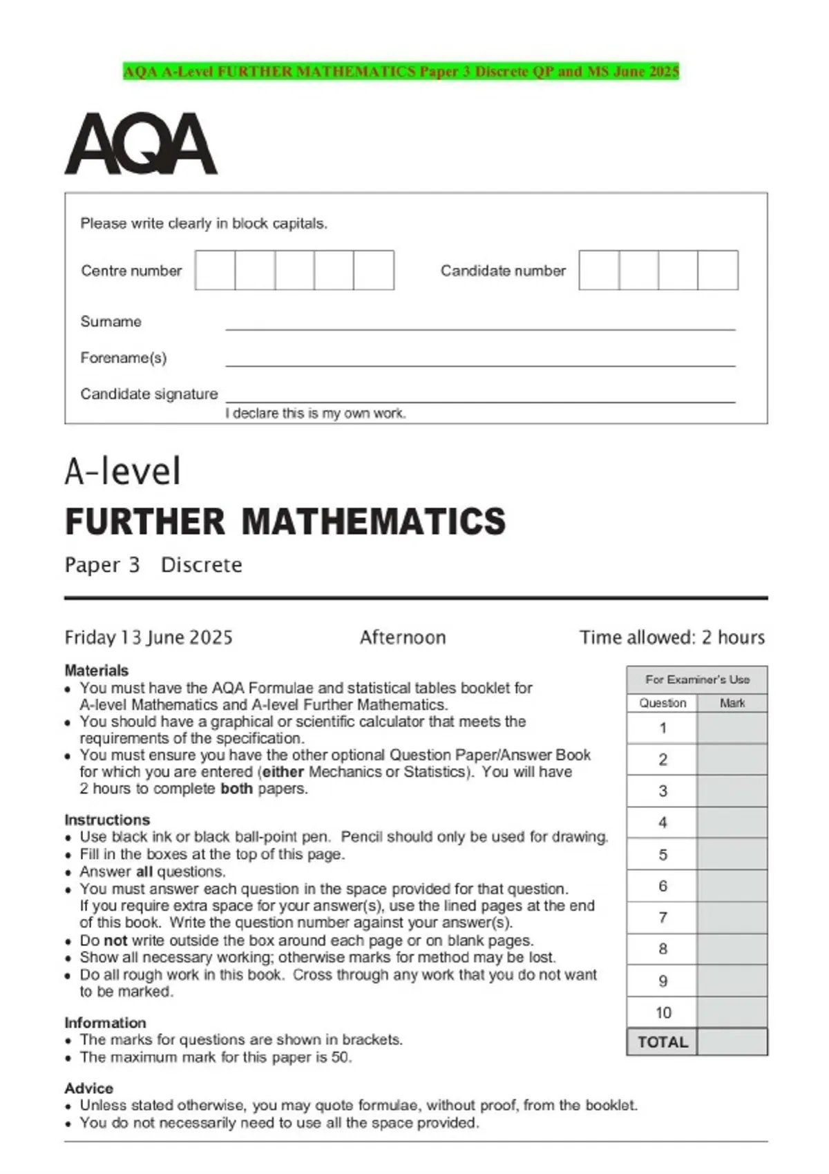 AQA A-Level FURTHER MATHEMATICS Paper 3 Discrete QP and MS June 2025