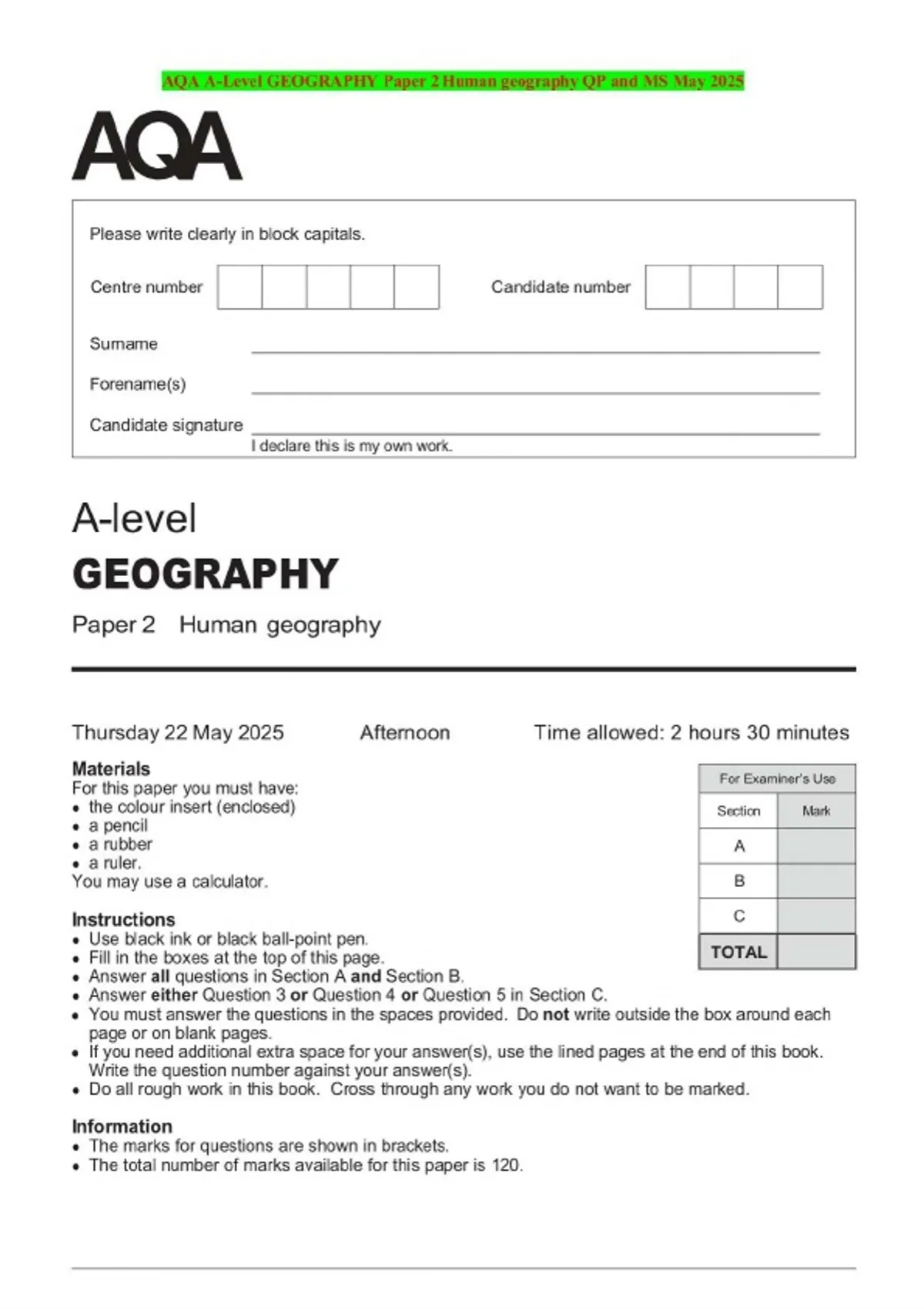 AQA A-Level GEOGRAPHY Paper 2Human geography QP and MS May 2025