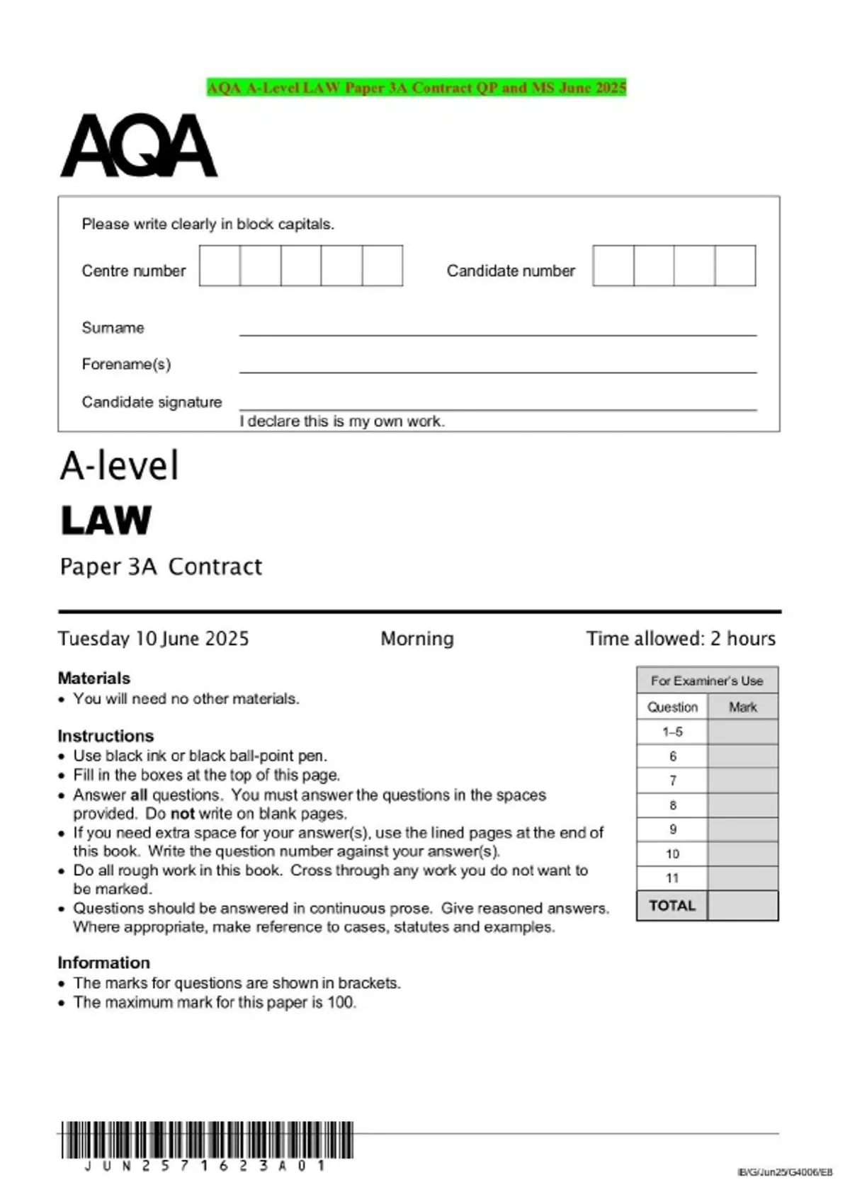 AQA A-Level LAW Paper 3A Contract QP and MS June 2025