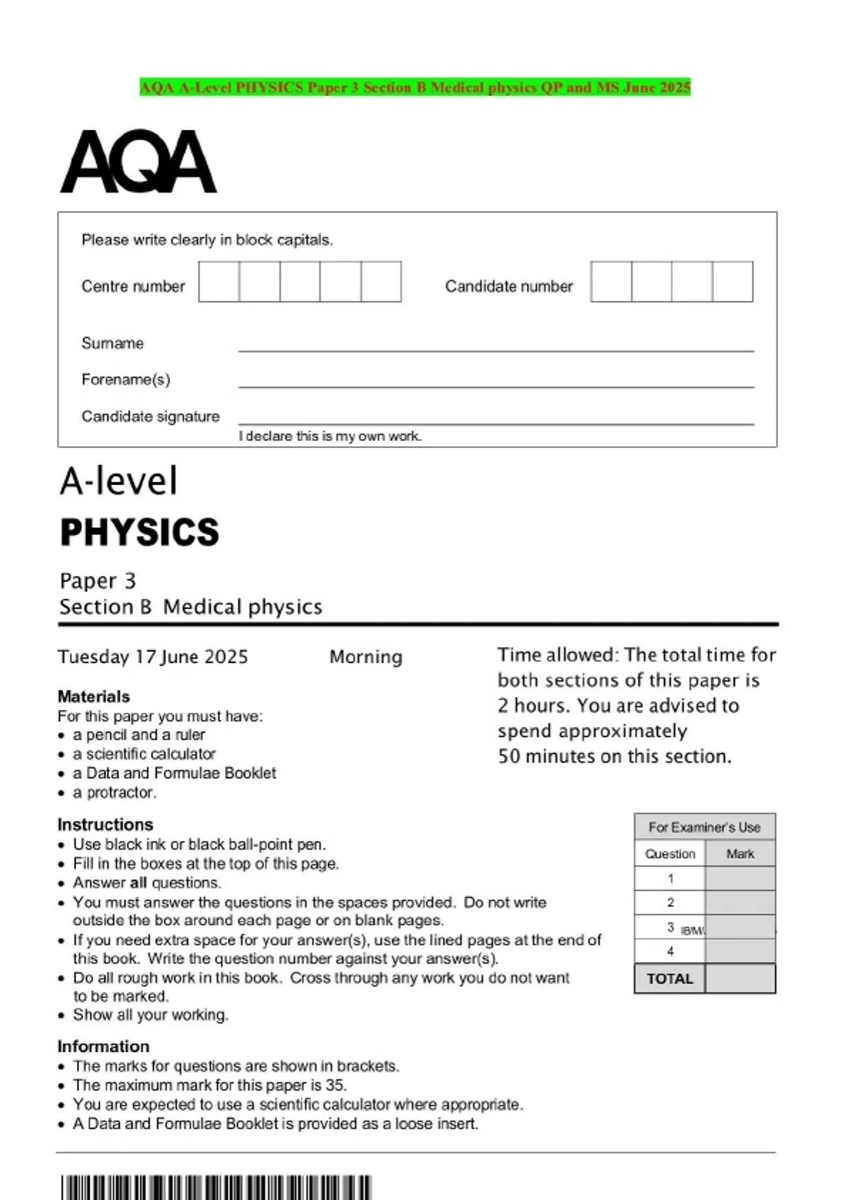 AQA A-Level PHYSICS Paper 3 Section B Medical physics QP and MS June 2025