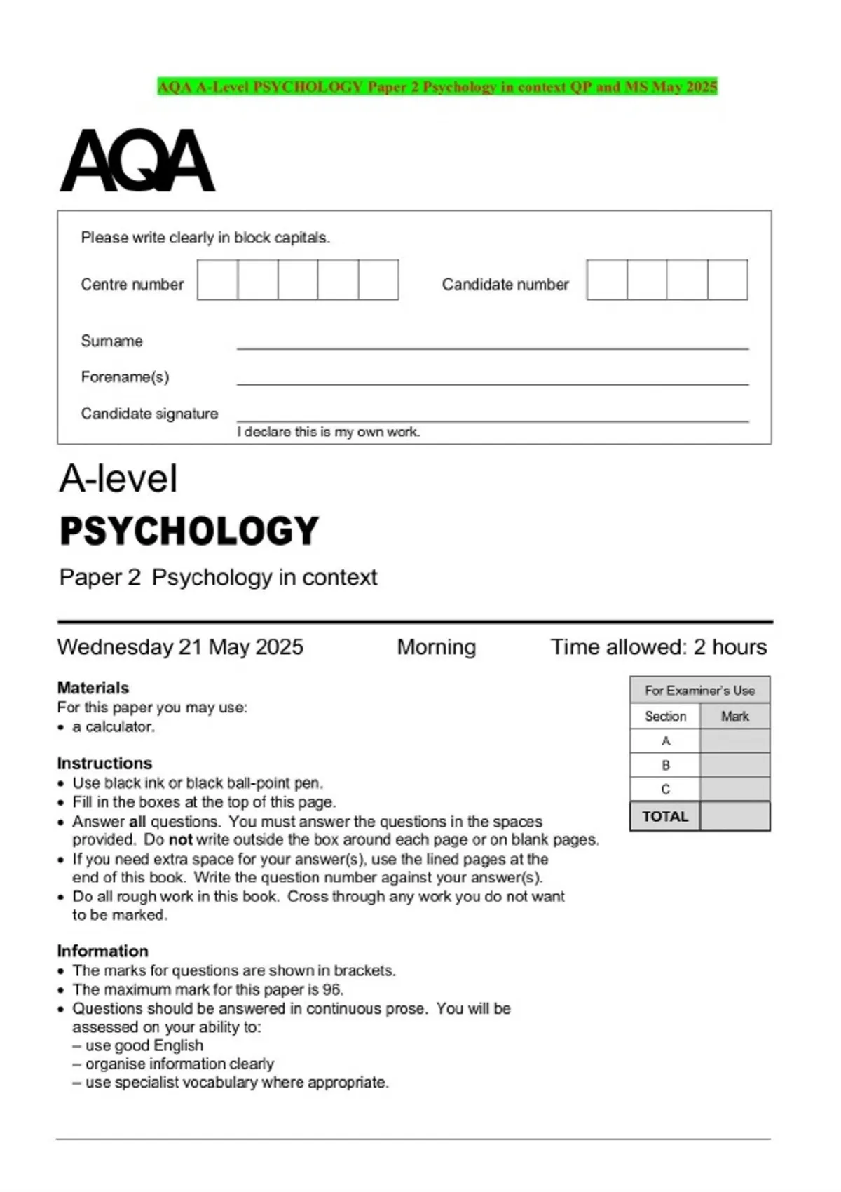 AQA A-Level PSYCHOLOGY Paper 2 Psychology in context QP and MS May 2025