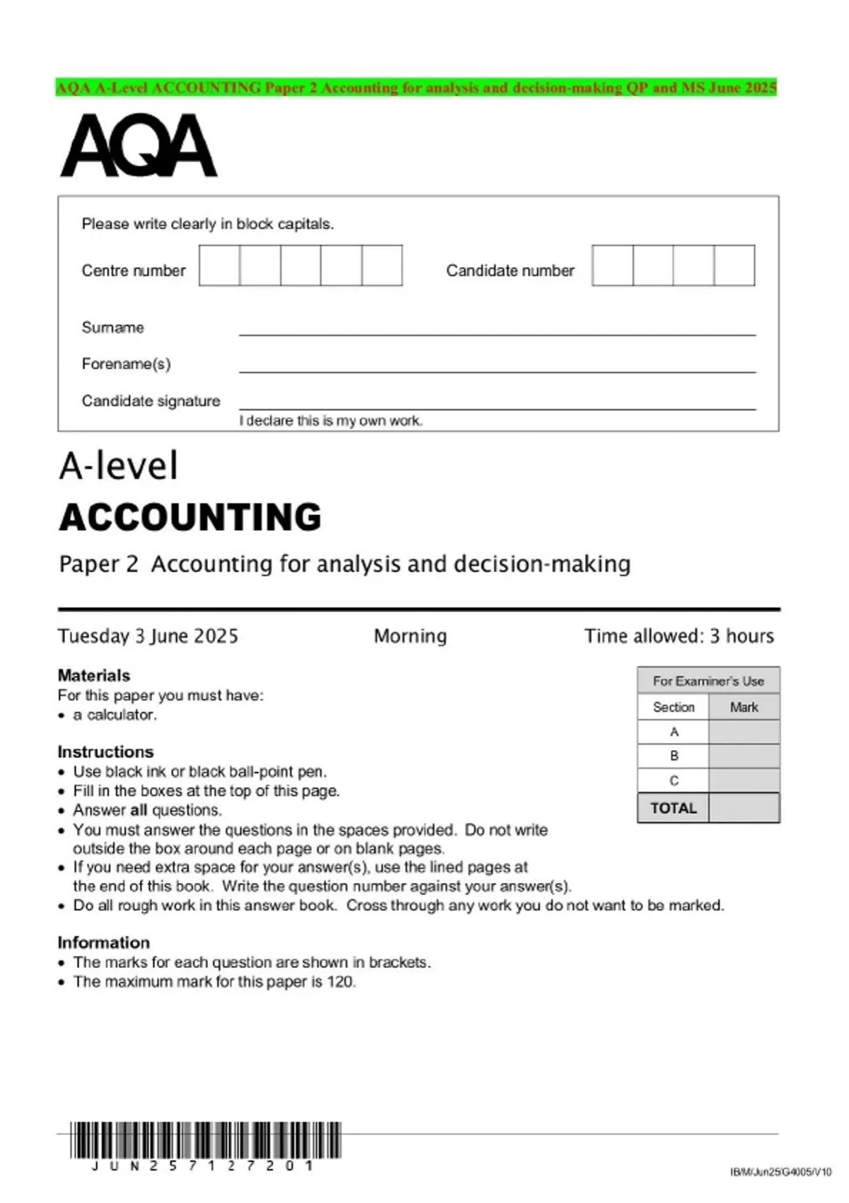 BUNDLE:::AQA A-LEVEL ACCOUNTING 2025 Combined Question Paper and Mark Scheme