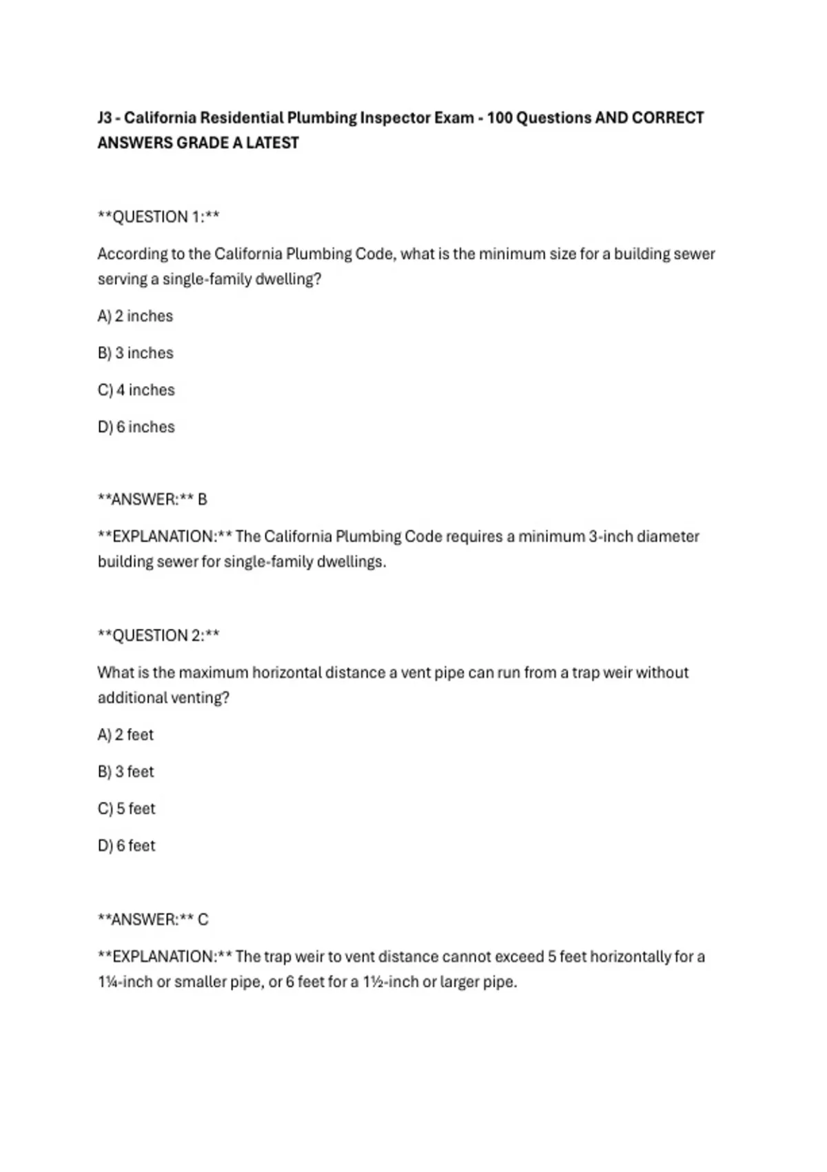 J3 - California Residential Plumbing Inspector Exam - 100 Questions AND CORRECT