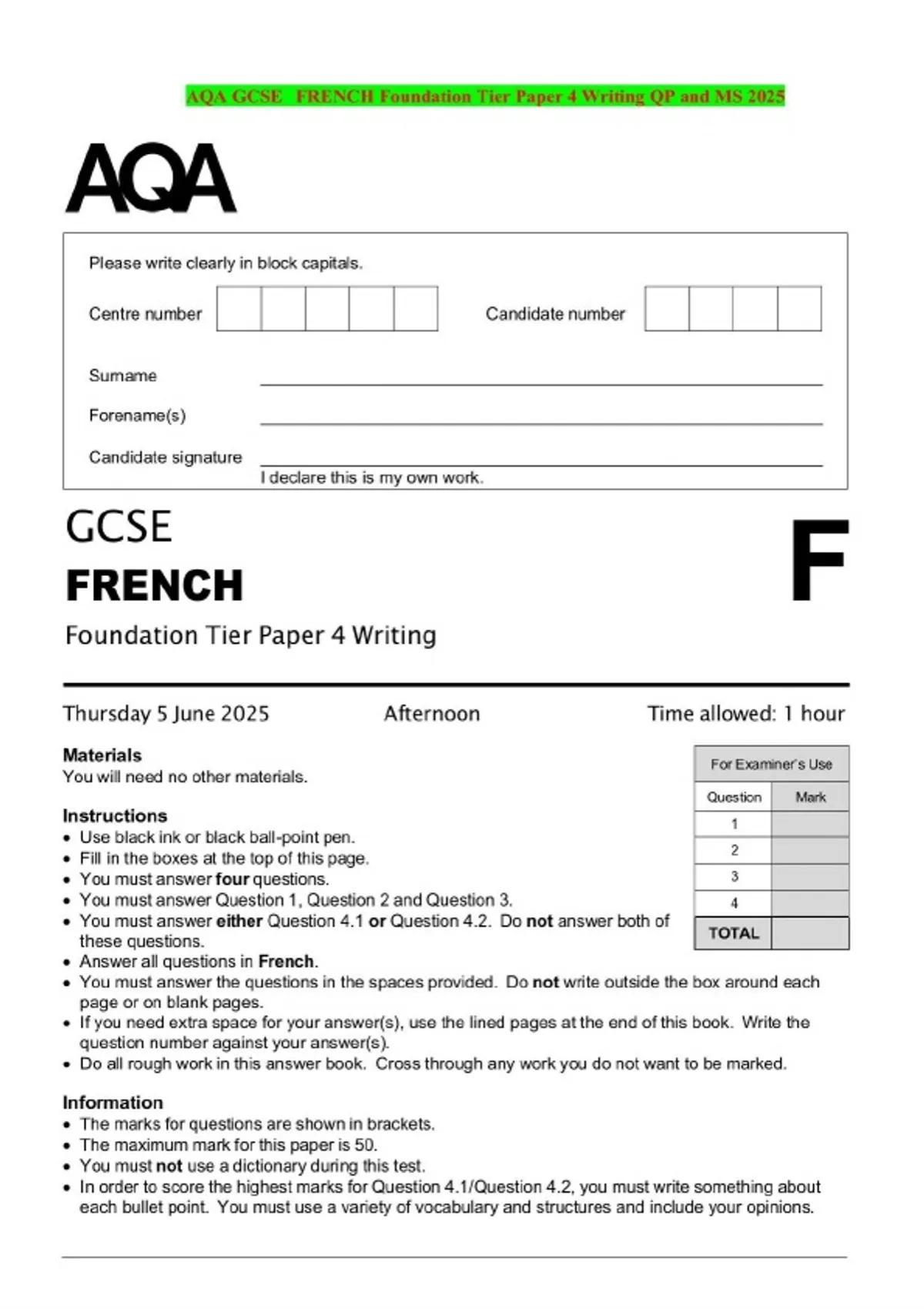 AQA GCSE FRENCH Foundation Tier Paper 4 Writing QP and MS 2025