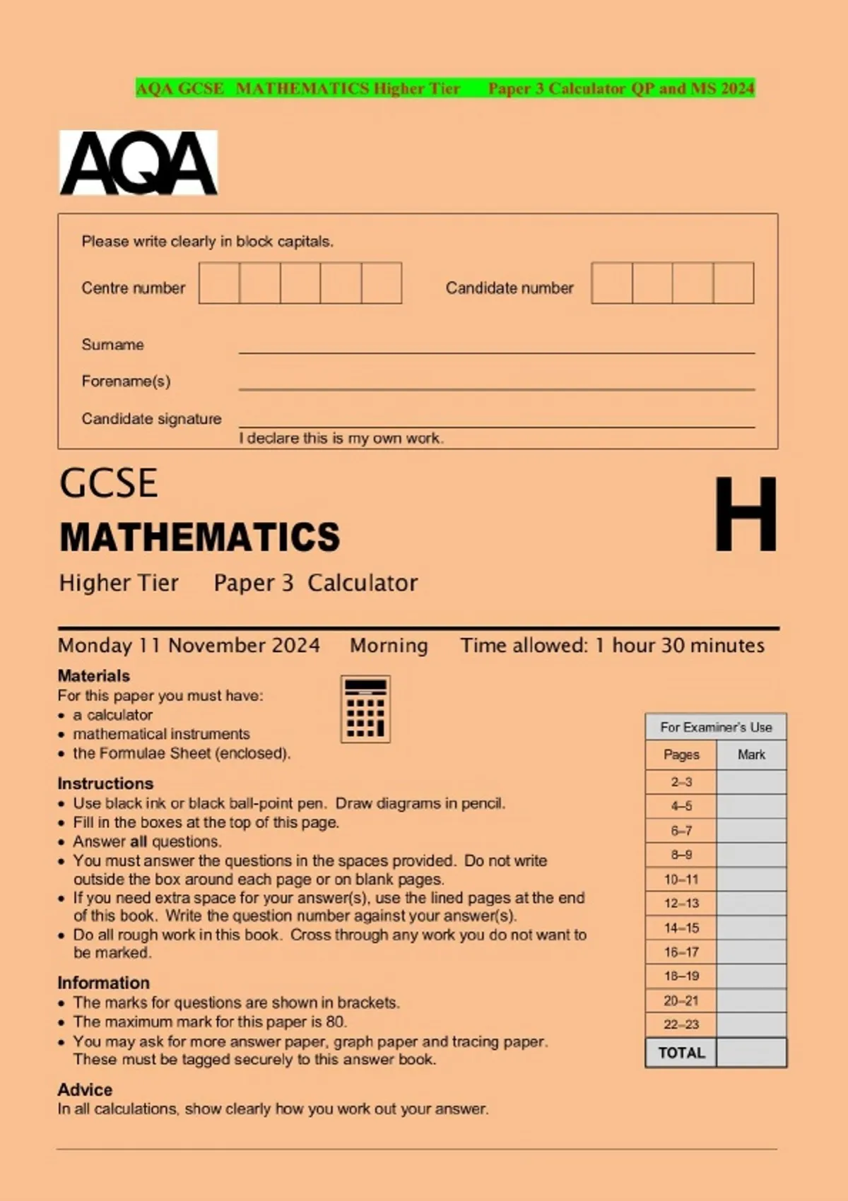 AQA GCSE MATHEMATICS Higher Tier Paper 3 Calculator QP and MS 2024
