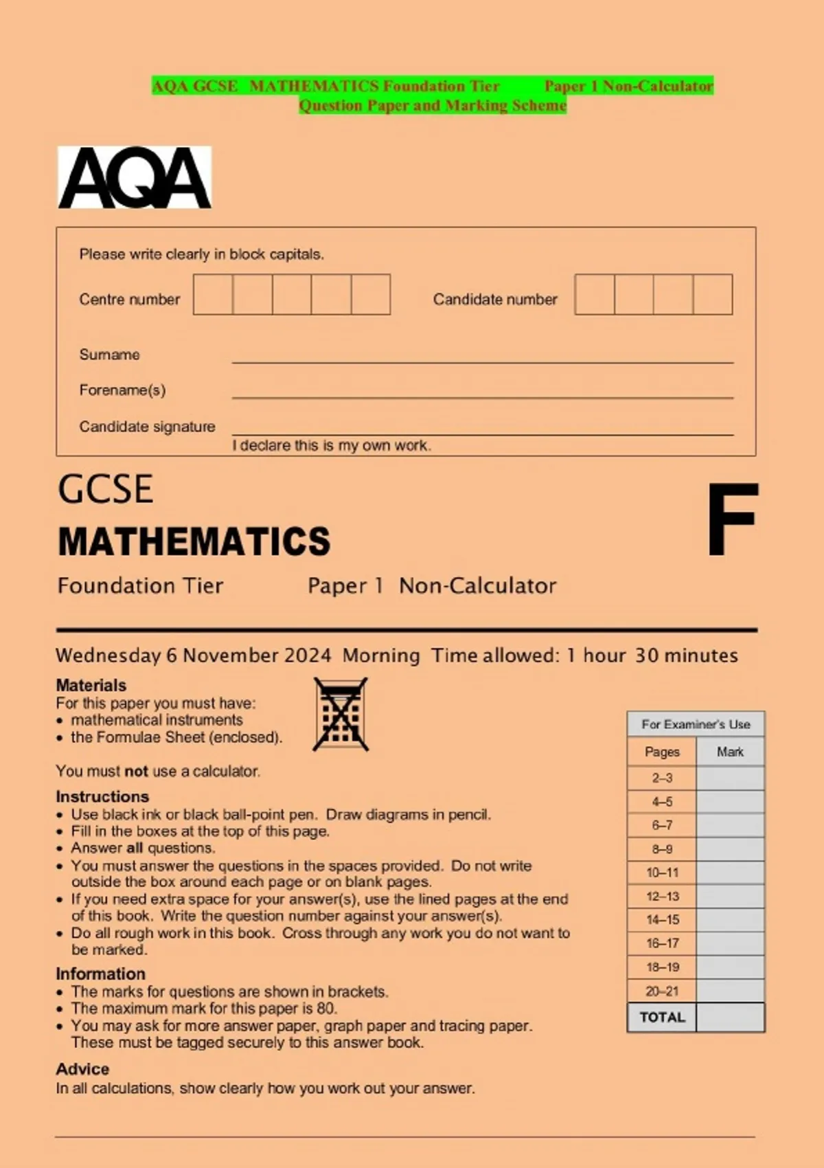 AQA GCSE MATHEMATICS Foundation Tier Paper 1 Non-Calculator Question Paper and Marking Scheme