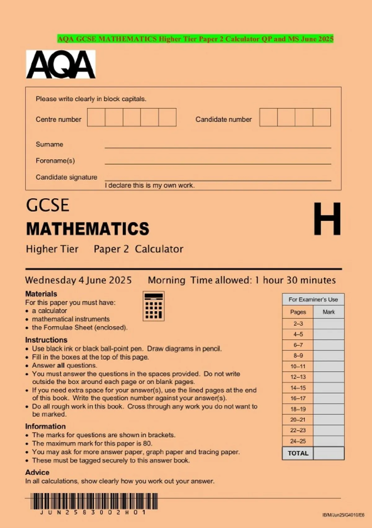 AQA GCSE MATHEMATICS Higher Tier Paper 2 Calculator QP and MS June 2025