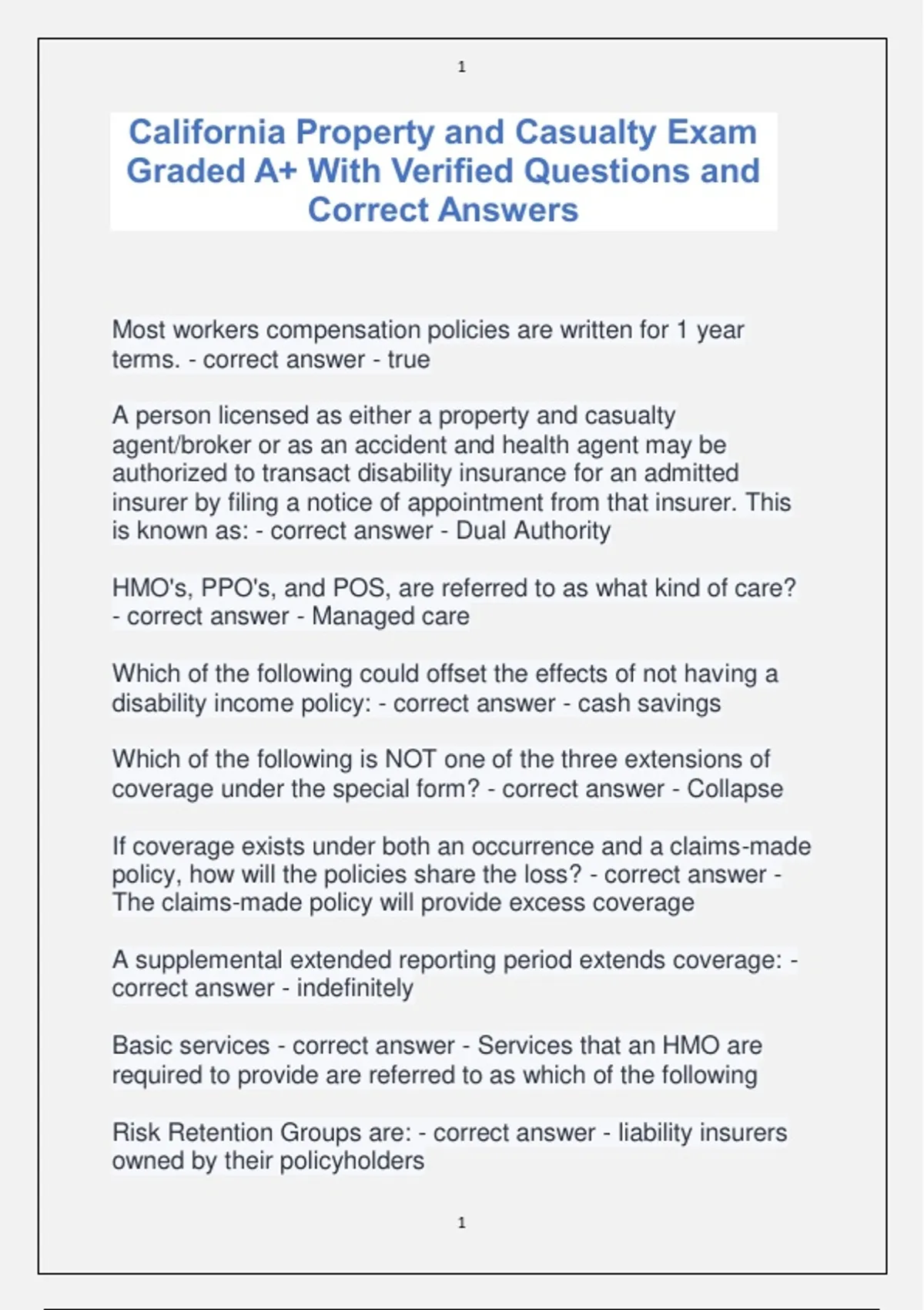 California Property and Casualty Exam Graded A+ With Verified Questions and Correct Answers