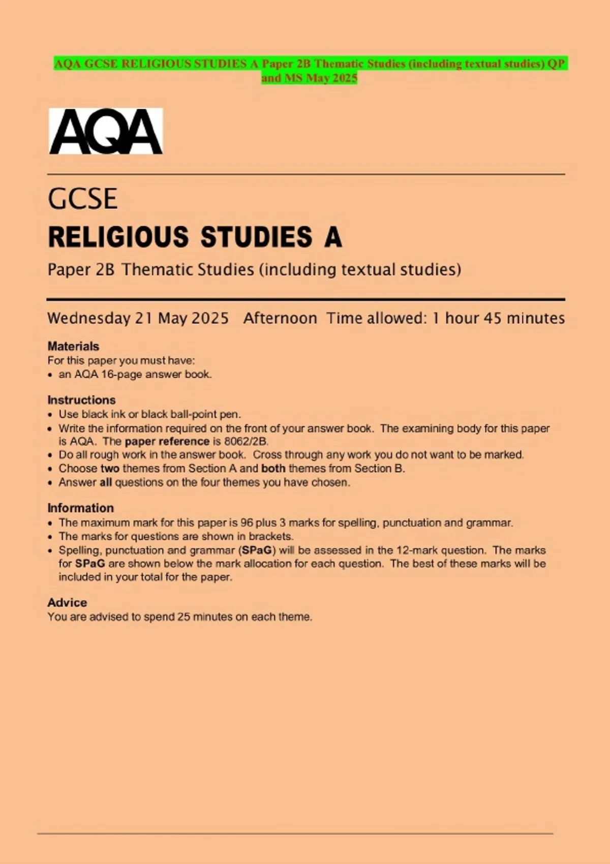 AQA GCSE RELIGIOUS STUDIES A Paper 2B Thematic Studies (including textual studies) QP and MS May 2025
