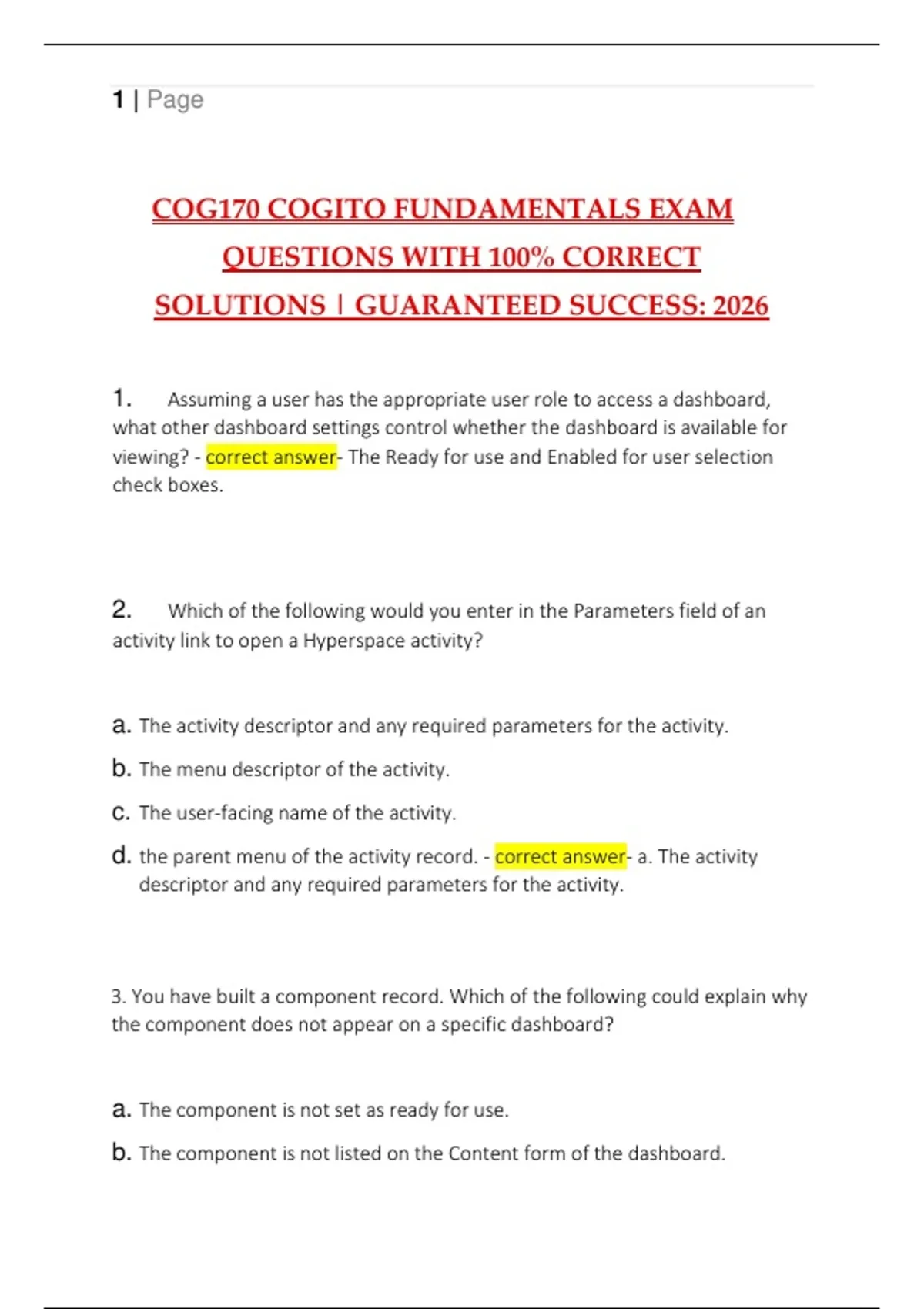 Access the complete COG170 COGITO Fundamentals Exam guide with 100% correct solutions for 2026. Learn about Epic Radar dashboards, components, Chronicles, Clarity, Caboodle, SlicerDicer, Workbench reports, and Cogito team roles.