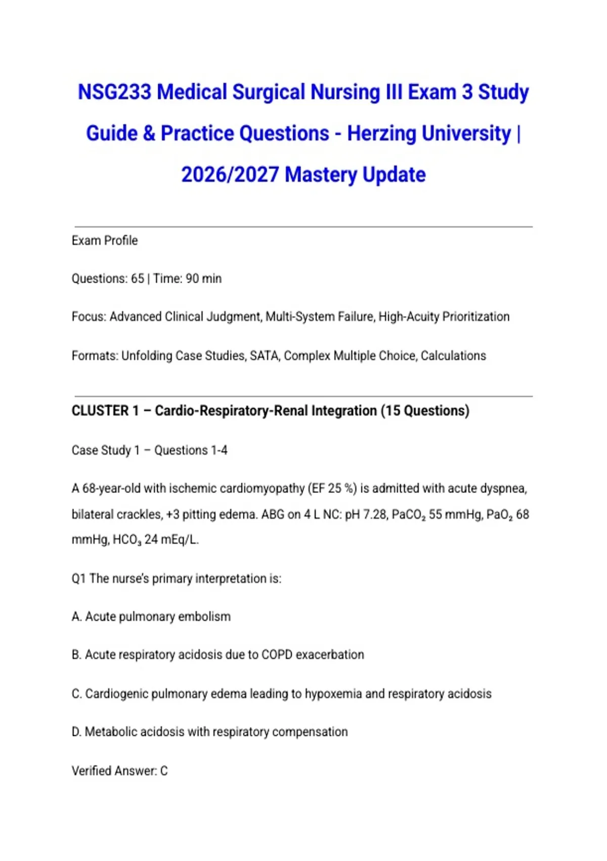 Achieve mastery in Herzing University's NSG233 Medical Surgical Nursing III with this comprehensive Exam 3 study guide, updated for the 2026/2027 curriculum. This essential Grade A resource covers critical care topics, complex patient management, and advanced pathophysiology. Prepare with detailed concept reviews, practice questions, and priority-setting scenarios that reflect the exam format. Perfect for mastering advanced med-surg concepts and building confidence for both your final exam and future NCLEX-RN success.