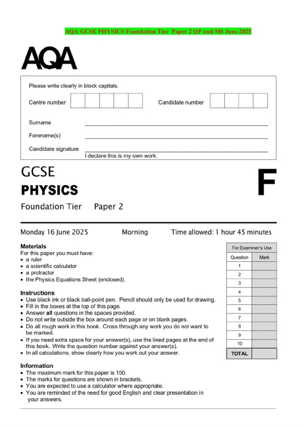 AQA GCSE PHYSICS Foundation Tier Paper 2 QP and MS June 2025