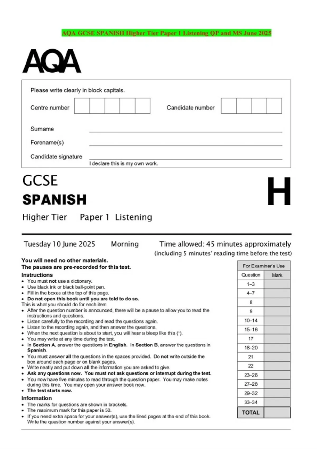 AQA GCSE SPANISH Higher Tier Paper 1 Listening QP and MS June 2025