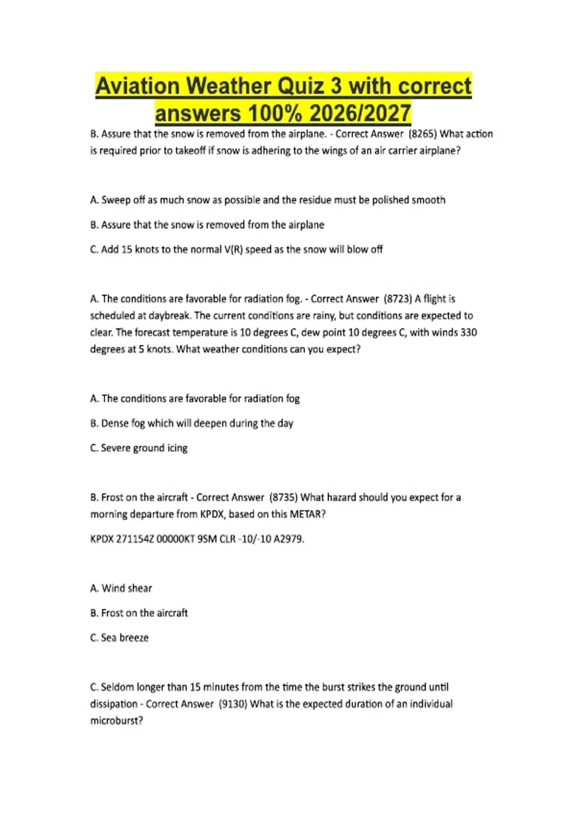 Aviation Weather Quiz 3 with correct answers 100% 2026/2027 B. Assure that the snow is removed from the airplane. - Correct Answer (8265) What action is required prior to takeoff if snow is adhering to the wings of an air carrier airplane? A. Sweep off as much snow as possible and the residue must be polished smooth B. Assure that the snow is removed from the airplane C. Add 15 knots to the normal V(R) speed as the snow will blow off A. The conditions are favorable for radiation fog. - Correct Answer (8723) A flight is scheduled at daybreak. The current conditions are rainy, but conditions are expected to clear. The forecast temperature is 10 degrees C, dew point 10 degrees C, with winds 330 degrees at 5 knots. What weather conditions can you expect? A. The conditions are favorable for radiation fog B. Dense fog which will deepen during the day C. Severe ground icing B. Frost on the aircraft - Correct Answer (8735) What hazard should you expect for a morning departure from KPDX, based on this METAR? KPDX 271154Z 00000KT 9SM CLR -10/-10 A2979. A. Wind shear B. Frost on the aircraft C. Sea breeze C. Seldom longer than 15 minutes from the time the burst strikes the ground until dissipation - Correct Answer (9130) What is the expected duration of an individual microburst? A. Five minutes with maximum winds lasting approximately 2 to 4 minutes B. One microburst may continue for as long as an hour C. Seldom longer than 15 minutes from the time the burst strikes the ground until dissipation C. 6,000 ft/min - Correct Answer (9131) Maximum downdrafts in a microburst encounter may be as strong as A. 1,500 ft/min B. 4,500 ft/min C. 6,000 ft/min B. 80 knots - Correct Answer (9132) An aircraft that encounters a headwind of 40 knots, within a microburst, may expect a total shear across the microburst of A. 40 knots B. 80 knots C. 90 knots