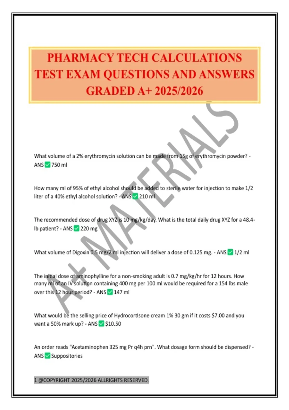 PHARMACY TECH CALCULATIONS TEST EXAM QUESTIONS AND ANSWERS GRADED A+ 2025/2026