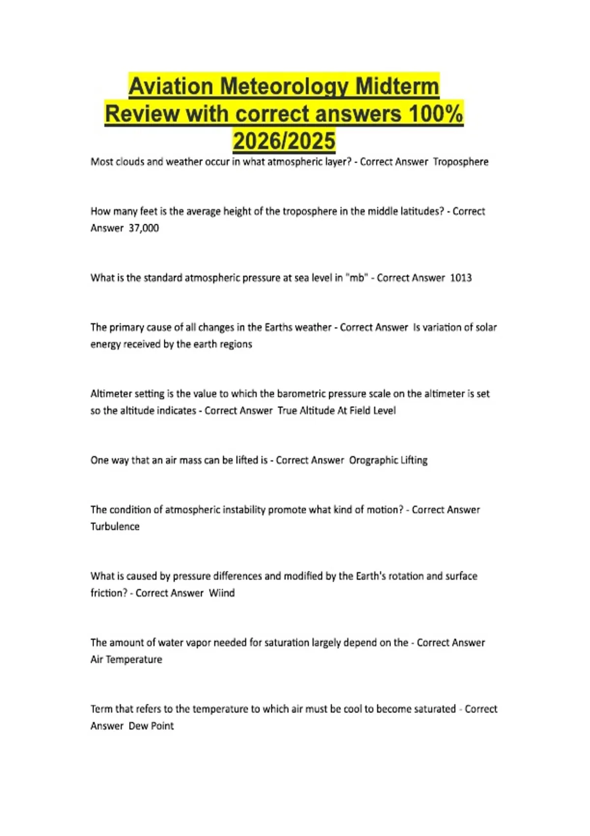 Aviation Meteorology Midterm Review with correct answers 100% 2026/2025 Most clouds and weather occur in what atmospheric layer? - Correct Answer Troposphere How many feet is the average height of the troposphere in the middle latitudes? - Correct Answer 37,000 What is the standard atmospheric pressure at sea level in "mb" - Correct Answer 1013 The primary cause of all changes in the Earths weather - Correct Answer Is variation of solar energy received by the earth regions Altimeter setting is the value to which the barometric pressure scale on the altimeter is set so the altitude indicates - Correct Answer True Altitude At Field Level One way that an air mass can be lifted is - Correct Answer Orographic Lifting The condition of atmospheric instability promote what kind of motion? - Correct Answer Turbulence What is caused by pressure differences and modified by the Earth's rotation and surface friction? - Correct Answer Wiind The amount of water vapor needed for saturation largely depend on the - Correct Answer Air Temperature Term that refers to the temperature to which air must be cool to become saturated - Correct Answer Dew Point Term that defines the height between the Earth's surface and the lowest cloud layer reported as broken or overcast - Correct Answer Ceiling Which weather conditions can be expected when moist air flows from a relatively warm surface to a colder surface - Correct Answer Fog When the temperature of the collecting surface is below the dew point of surrounding air and the dew point is colder then freezing, it results in the formation of - Correct Answer Frost The four families of clouds are - Correct Answer Low clouds, clouds with extensive vertical development, high class, middle clouds On warm days pressure