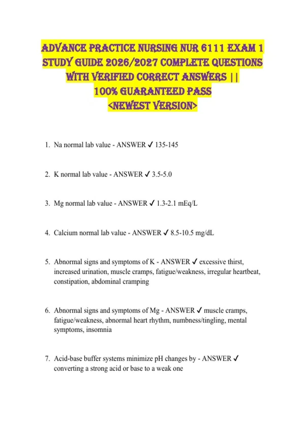 Advance Practice Nursing NUR 6111 Exam 1 STUDY GUIDE 2026/2027 COMPLETE QUESTIONS WITH VERIFIED CORRECT ANSWERS || 100% GUARANTEED PASS &lt;NEWEST VERSION&gt; 1. Na normal lab value - ANSWER 135-145 2. K normal lab value - ANSWER 3.5-5.0 3. Mg normal lab value - ANSWER 1.3-2.1 mEq/L 4. Calcium normal lab value - ANSWER 8.5-10.5 mg/dL 5. Abnormal signs and symptoms of K - ANSWER excessive thirst, increased urination, muscle cramps, fatigue/weakness, irregular heartbeat, constipation, abdominal cramping 6. Abnormal signs and symptoms of Mg - ANSWER muscle cramps, fatigue/weakness, abnormal heart rhythm, numbness/tingling, mental symptoms, insomnia 7. Acid-base buffer systems minimize pH changes by - ANSWER converting a strong acid or base to a weak one 8. Types of hypersensitivity reactions - ANSWER Type 1: Immunoglobulin IgE mediated reactions(allergic reaction), rapid time frame, ex peanut allergy Type 2: tissue specific, activates complement cascade/phagocytosis, body attacks healthy RBC thinking they are foreign, ex graves, hep induced thrombocytopenia Type 3: immune complexes formed in circulation and deposited into cell wall and cause tissue damage , ex is rayanuds Type 4: delayed sensitivity, only type that is mediated by T lymphocytes and do not involve antibodies, ex contact sensitivity to poison ivy, latex, mycobacterial infection 9. Prematurity - ANSWER baby born before 37 weeks gestation, causes: maternal age, multiple pregnancies, uterine or cervical abnormalities, infections/chronic conditions. Clinical findings of premature babies: low birth weight, jaundice, feeding difficulties 10. systemic sclerosis - ANSWER a diffuse connective tissue disease that may involve any system causing inflammation, degeneration, and fibrosis 11. RA (rheumatoid arthritis) - ANSWER Autoimmune disease causing inflammation of the synovial membrane and other parts of the joints. 12. Graves disease - ANSWER an autoimmune disorder that is caused by hyperthyroidism and is characterized by goiter and/or exophthalmos(bulging eyes) 13. Cell Phases in Mitosis - ANSWER 1. interphase(DNA replicates and cell prepares for divison), 2. prophase(centriolesseparate and move to poles), 3. metaphase(chromosomes line up and attach to spindle fiber) , 4. anaphase(spindles pull apart to create separate chromosomes), 5. telophase(chromosomes decondense and nuclear envelope reforms) 14. Causes of cellular injury - ANSWER 1. Inflammation 2. Nutritional Deficiency or excess 3. Hypoxia 4. Trauma 5. Genetic Mutations 6. Infections 15. Basal cell carcinoma - ANSWER Commonly presents as a pearly nodule with rolled borders and telangiectasia, especially on sun-exposed areas such as the face and lips. 16. Diagnosis for a 73-year-old woman with a new painless, pearly, ulcerated nodule - ANSWER Basal cell carcinoma (BCC) 17. True statement regarding Basal Cell Carcinoma - ANSWER Commonly occurs on head, neck, and nose. 18. Symptoms of herpes zoster (shingles) - ANSWER Low-grade fever, headache, and burning pain on one side of the back with a unilateral vesicular rash that does not cross the midline. 19. Appropriate treatment plan for herpes zoster - ANSWER Oral acyclovir 800 mg five times daily for 7-10 days. 20. Management for red and scaly lesions on the scalp - ANSWER Woods lamp examination can be helpful in diagnosis. 21. Recommended shampoo for scalp lesions - ANSWER 1% or 2.5% selenium sulfide shampoo (Selsun) is recommended. 22. Follow-up evaluation for scalp lesions - ANSWER A negative culture after treatment is necessary for follow-up evaluation. 23. Requirement for antifungal treatment in scalp lesions - ANSWER This condition does not require antifungal treatment. 24. First-line therapy for scalp lesions - ANSWER Oral corticosteroids are first-line therapy. 25. Characteristics of basal cell carcinoma - ANSWER Grows slowly and rarely metastasizes. 26. Presentation of basal cell carcinoma - ANSWER Pearly nodule with rolled edges and overlying telangiectasia. 27. Common locations for basal cell carcinoma - ANSWER Primarily occurs on sun-exposed areas such as the head, neck, and nose. 28. Treatment for herpes zoster - ANSWER Early antiviral treatment with oral acyclovir reduces duration and severity. 29. Symptoms indicating shingles - ANSWER Unilateral vesicular rash that does not cross the midline.