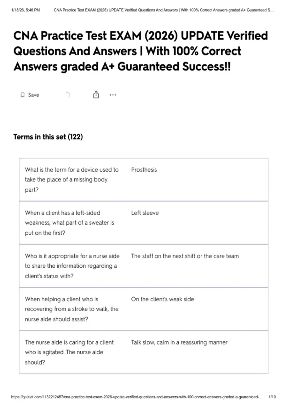, 1/18/26, 5:46 PM CNA Practice Test EXAM (2026) UPDATE Verified Questions And Answers | With 100% Correct Answers graded A+ Guaranteed S…
