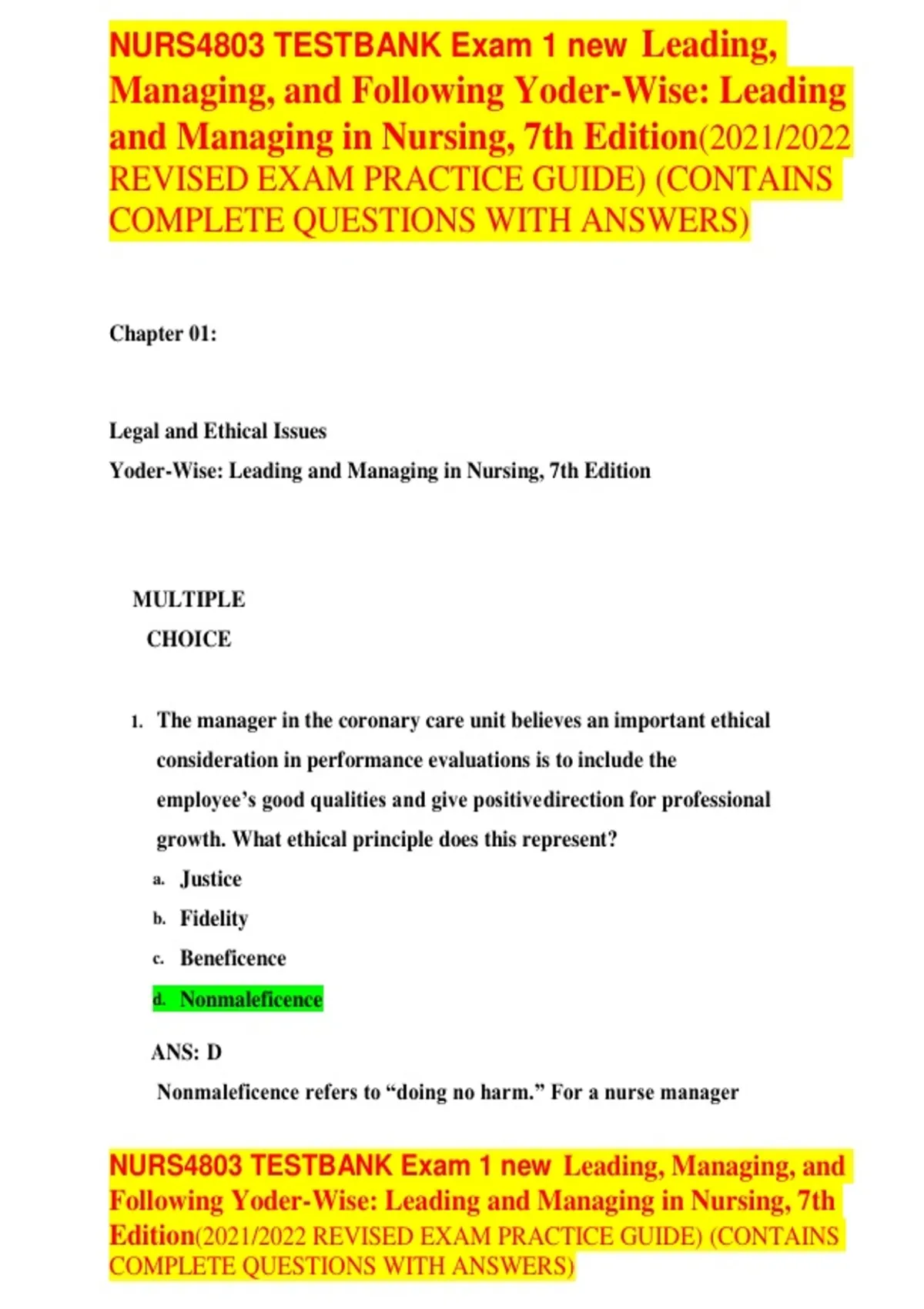 NURS4803 TESTBANK Exam 1 new Leading, Managing, and