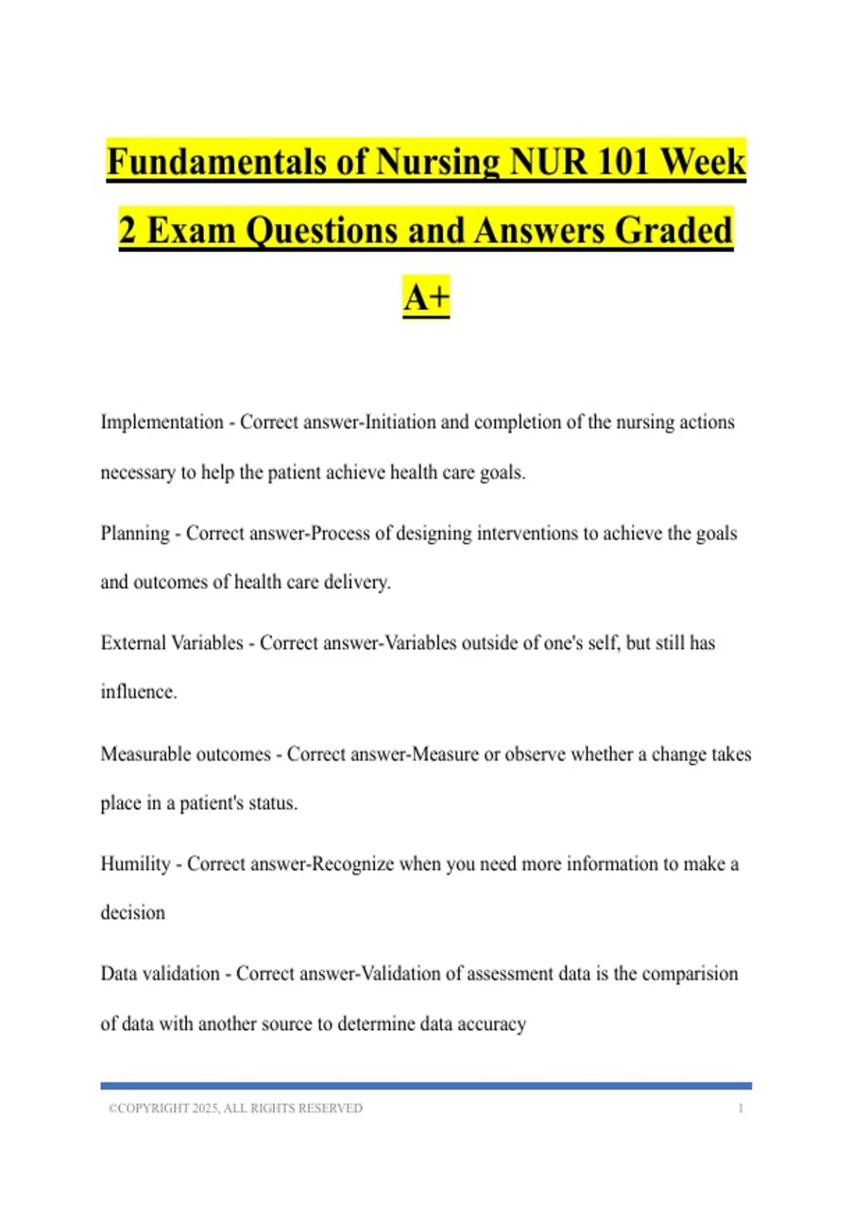 Fundamentals of Nursing NUR 101 Week 2 Exam Questions and Answers Graded A+