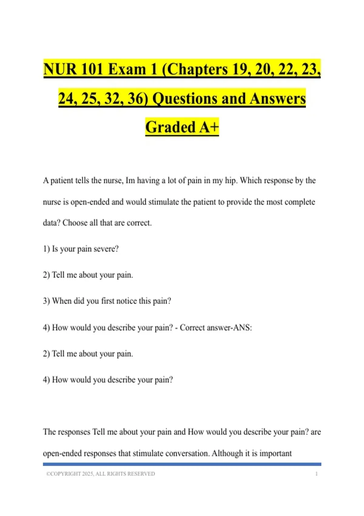 NUR 101 Exam 1 (Chapters 19, 20, 22, 23, 24, 25, 32, 36) Questions and Answers Graded A+
