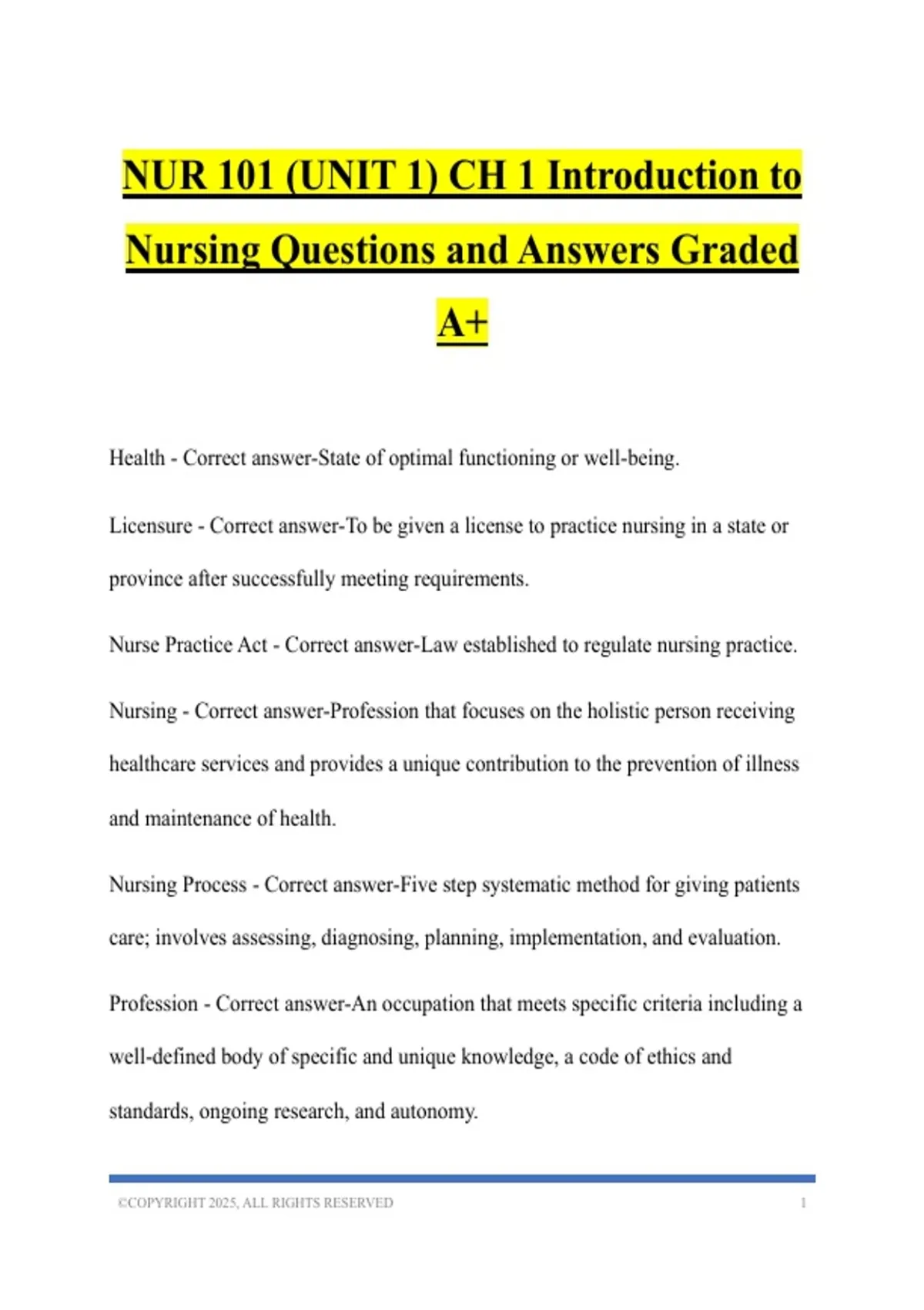 NUR 101 (UNIT 1) CH 1 Introduction to Nursing Questions and Answers Graded A+