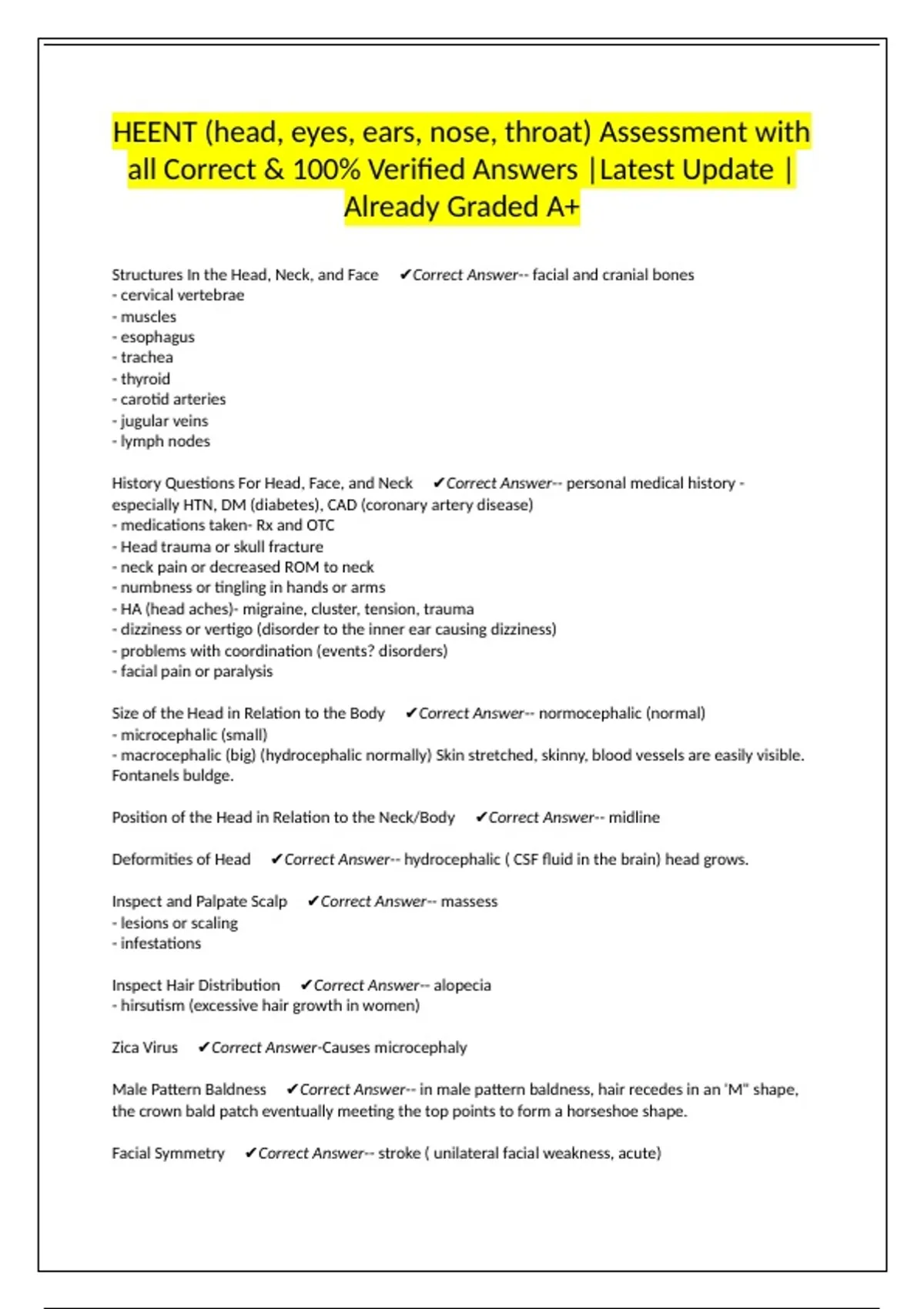 HEENT (head, eyes, ears, nose, throat) Assessment with all Correct & 100% Verified Answers |Latest Update |Already Graded A+