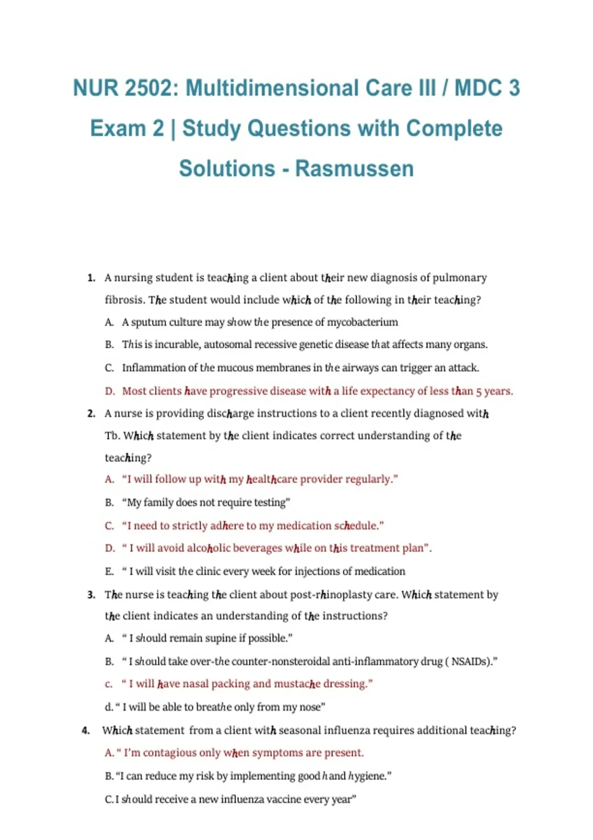 This document contains NUR 2502 (Multidimensional Care III / MDC 3) Exam 2 study questions with complete, accurate solutions aligned with Rasmussen University coursework. It covers key clinical concepts, nursing interventions, patient care scenarios, and exam-relevant topics commonly assessed in Exam 2. The material is ideal for structured revision, self-testing, and reinforcing critical thinking skills before the exam.