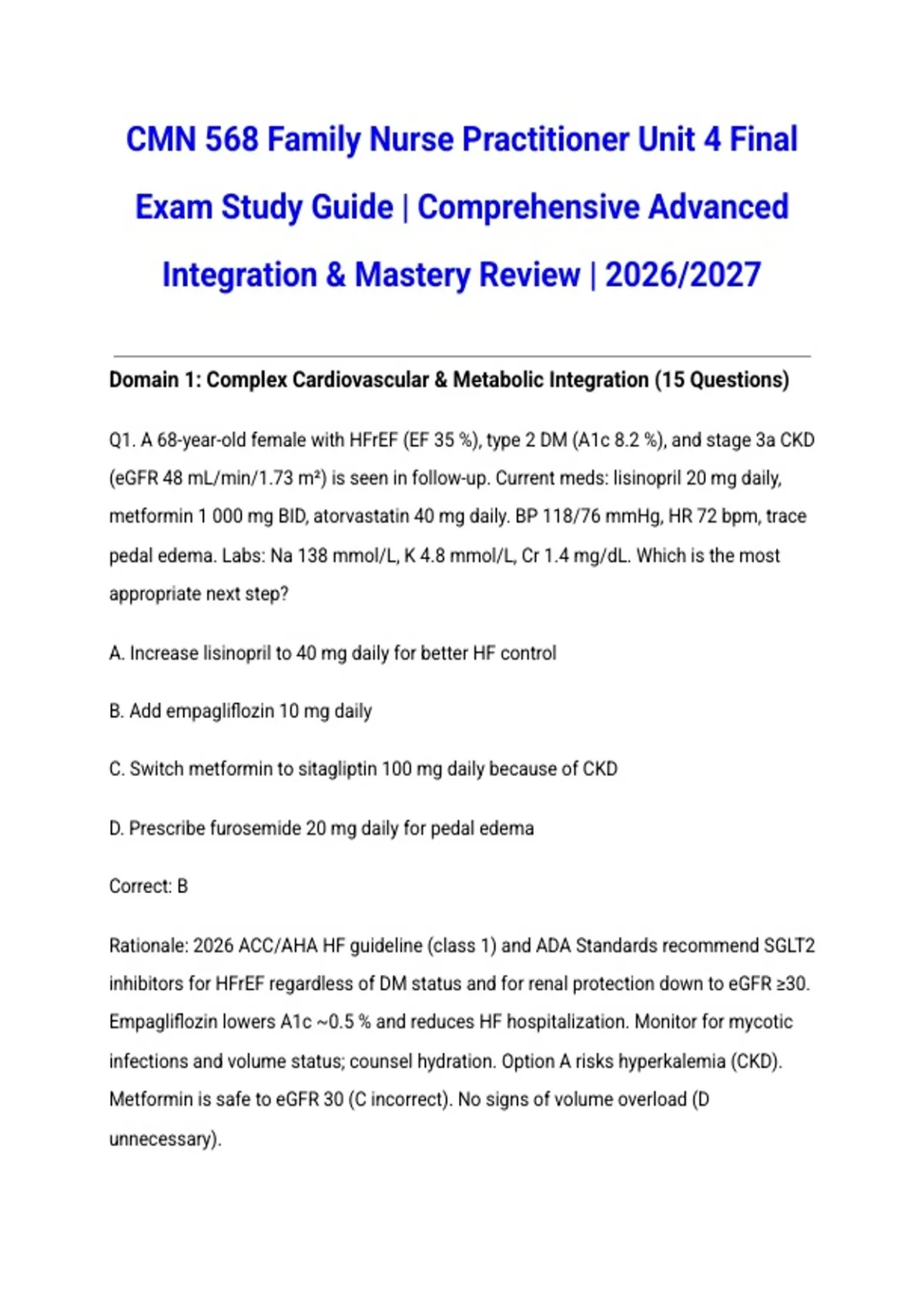 Q1. A 68-year-old female with HFrEF (EF 35 %), type 2 DM (A1c 8.2 %), and stage 3a CKD