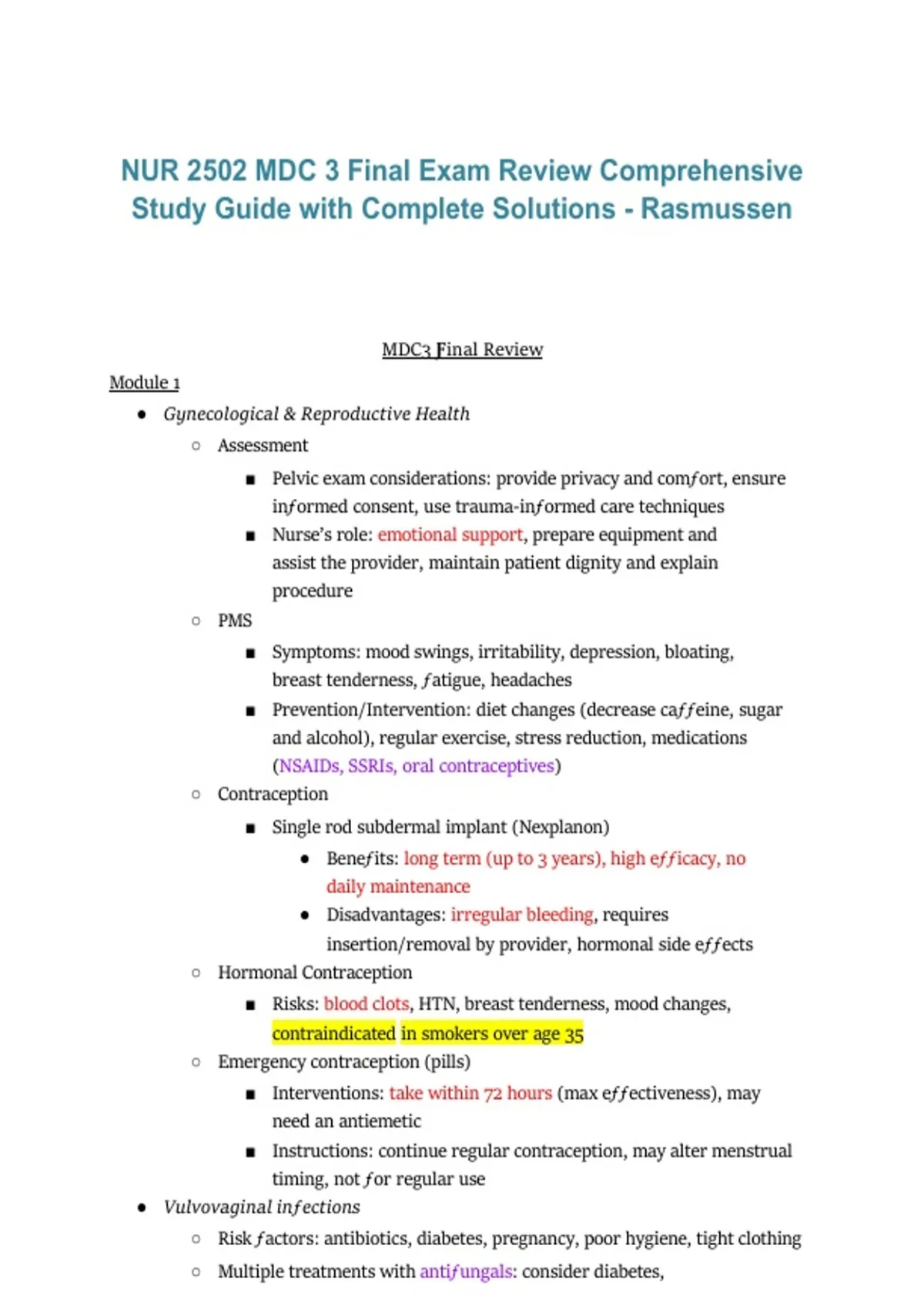 This comprehensive study guide provides a full review for the NUR 2502 (Multidimensional Care III / MDC 3) final exam at Rasmussen University. It includes exam-focused review questions with complete, accurate solutions covering all major clinical concepts, nursing interventions, patient care priorities, and critical thinking scenarios assessed throughout the course. The material is ideal for in-depth revision, self-testing, and final exam preparation.