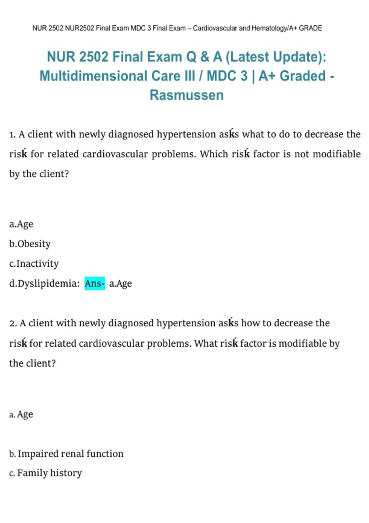 This document contains the latest updated questions and answers for the NUR 2502 (Multidimensional Care III / MDC 3) final exam at Rasmussen University. It covers comprehensive clinical concepts, nursing interventions, patient care priorities, and critical thinking scenarios commonly assessed on the final exam. The material is designed for effective revision, self-testing, and confident final exam preparation.
