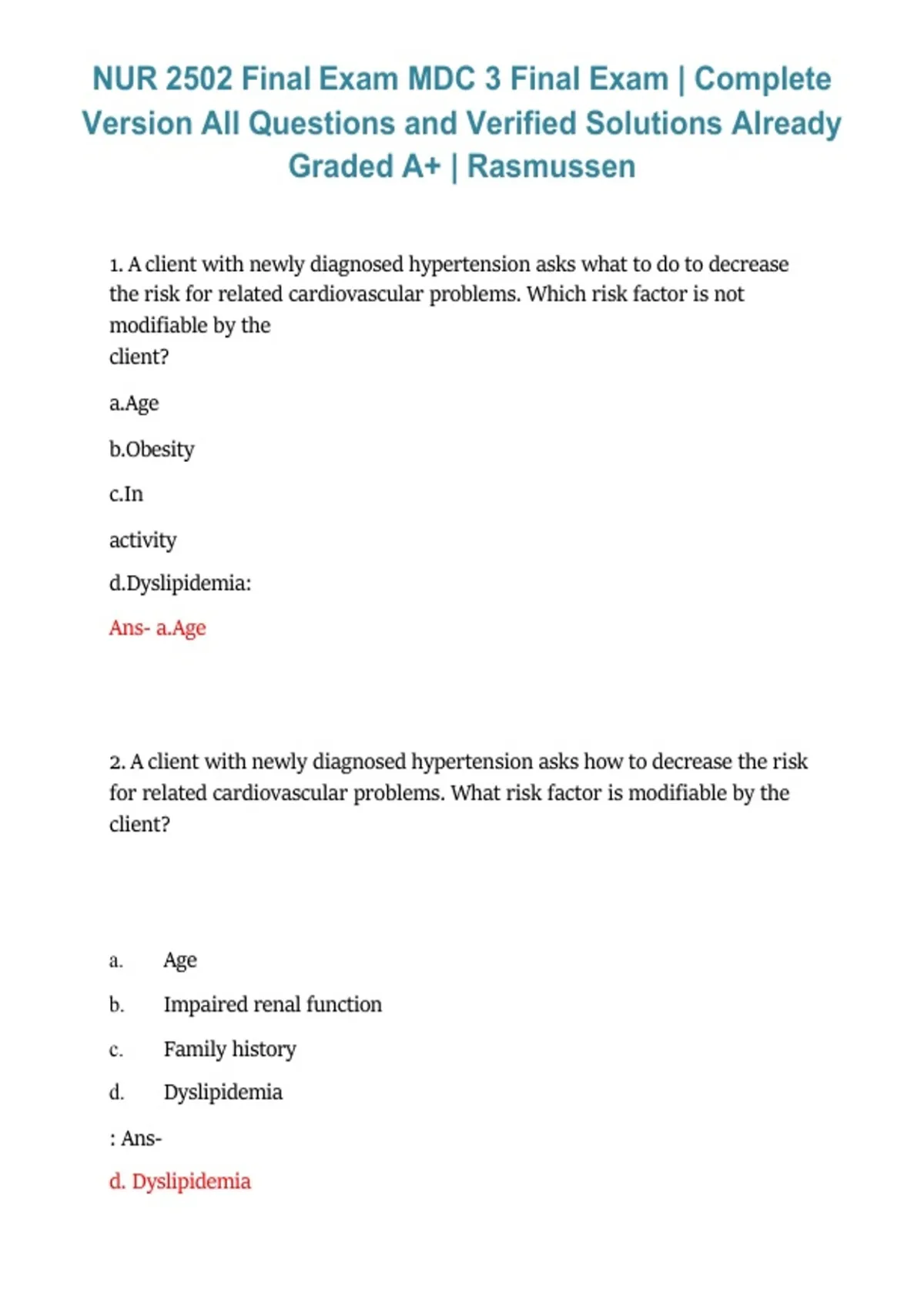 1. A client with newly diagnosed hypertension asks what to do to decrease