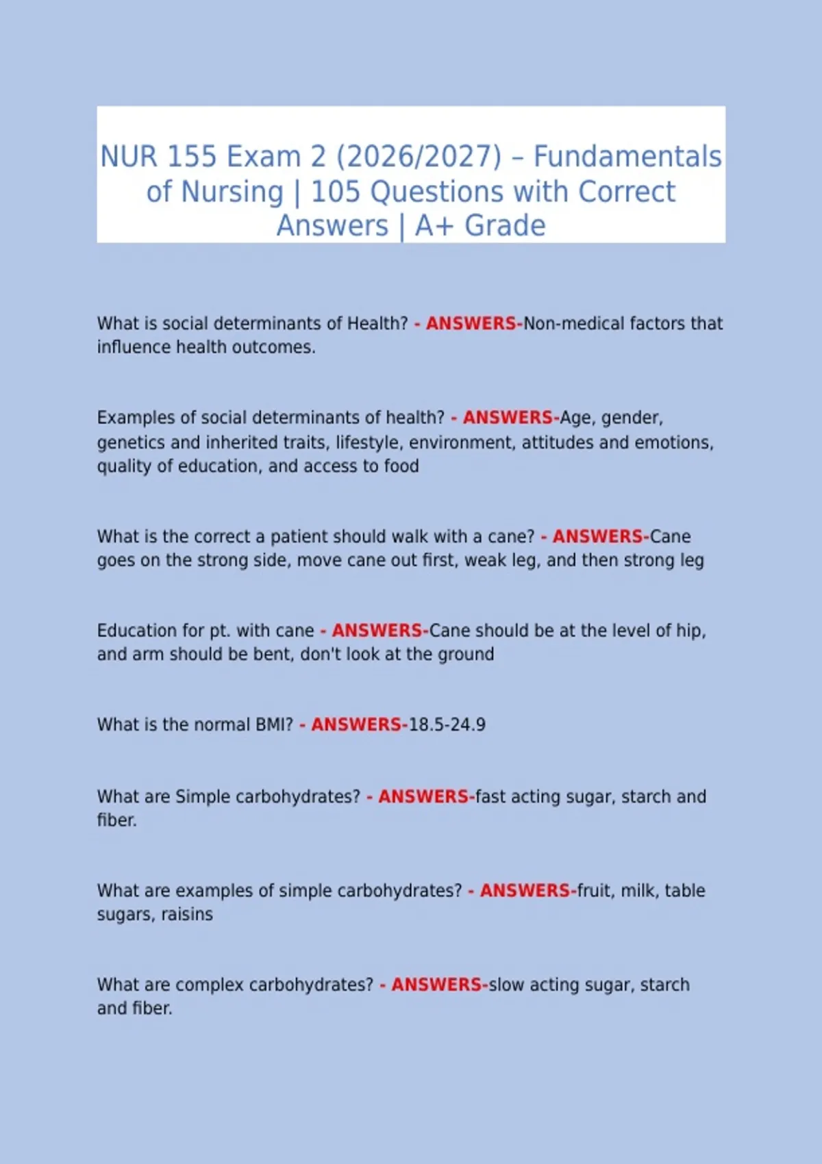 NUR 155 Exam 2 (2026/2027) – Fundamentals of Nursing | 105 Questions with Correct Answers | A+ Grade