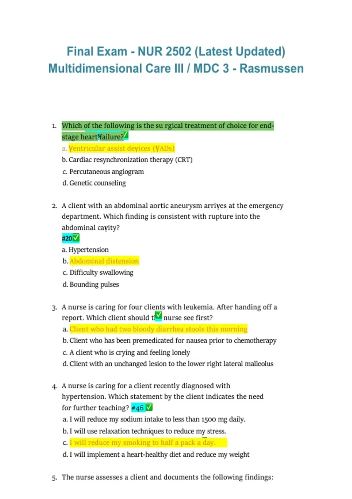 This document contains the latest updated final exam material for NUR 2502 (Multidimensional Care III / MDC 3) at Rasmussen University. It covers comprehensive clinical concepts, nursing interventions, patient care priorities, and critical-thinking scenarios assessed throughout the course. The content is structured to support thorough revision, self-testing, and confident preparation for the MDC 3 final exam.