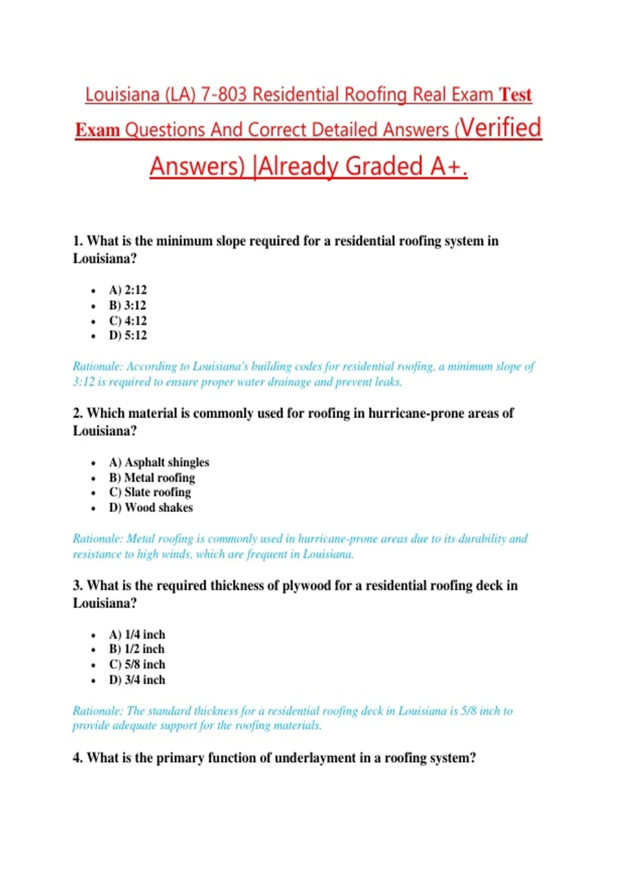 Louisiana (LA) 7-803 Residential Roofing Real Exam Test Exam Questions And Correct Detailed Answers (Verified Answers) |Already Graded A+.