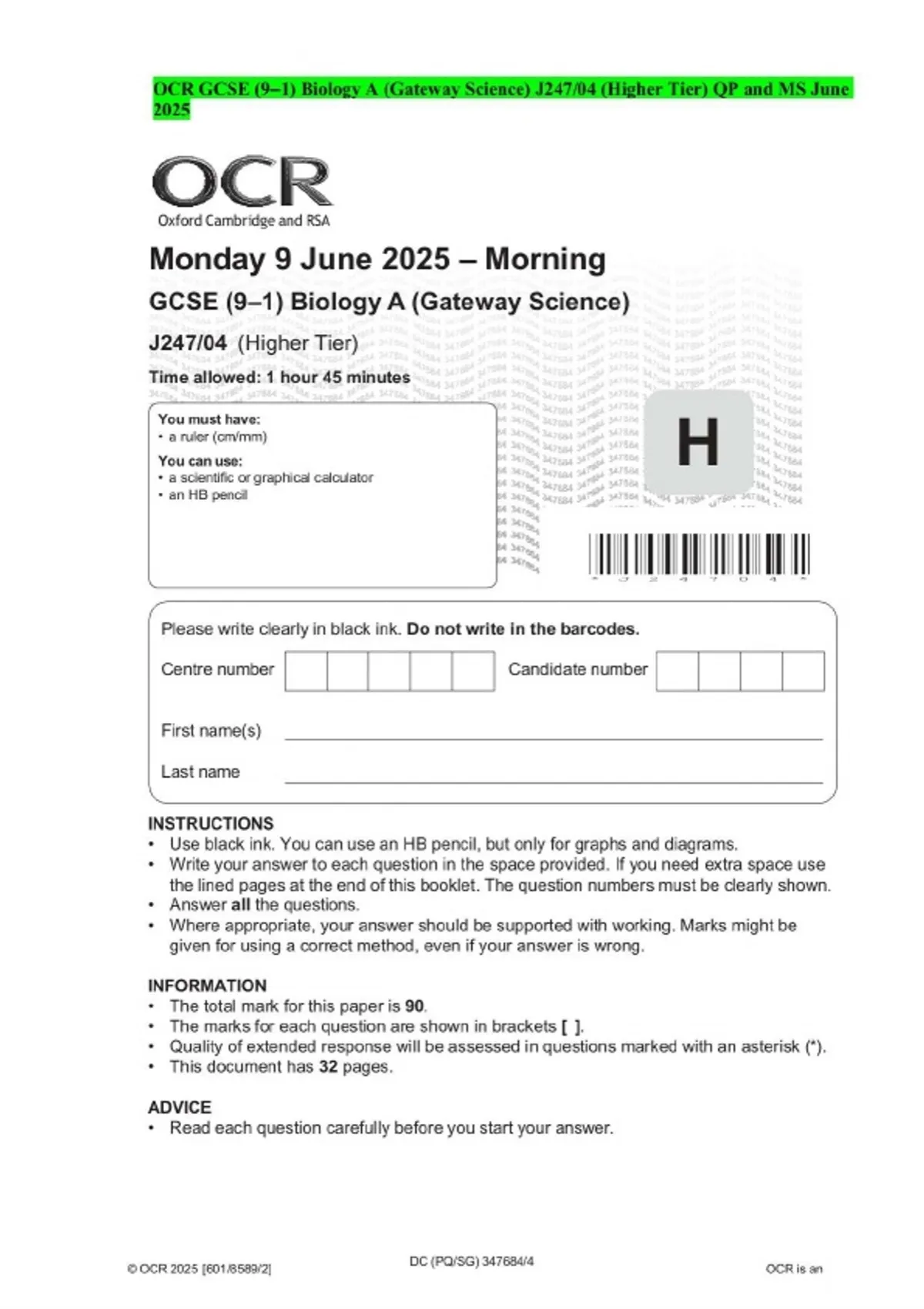 OCR GCSE (9–1) Biology A (Gateway Science) J247/04 (Higher Tier) QP and MS June 2025