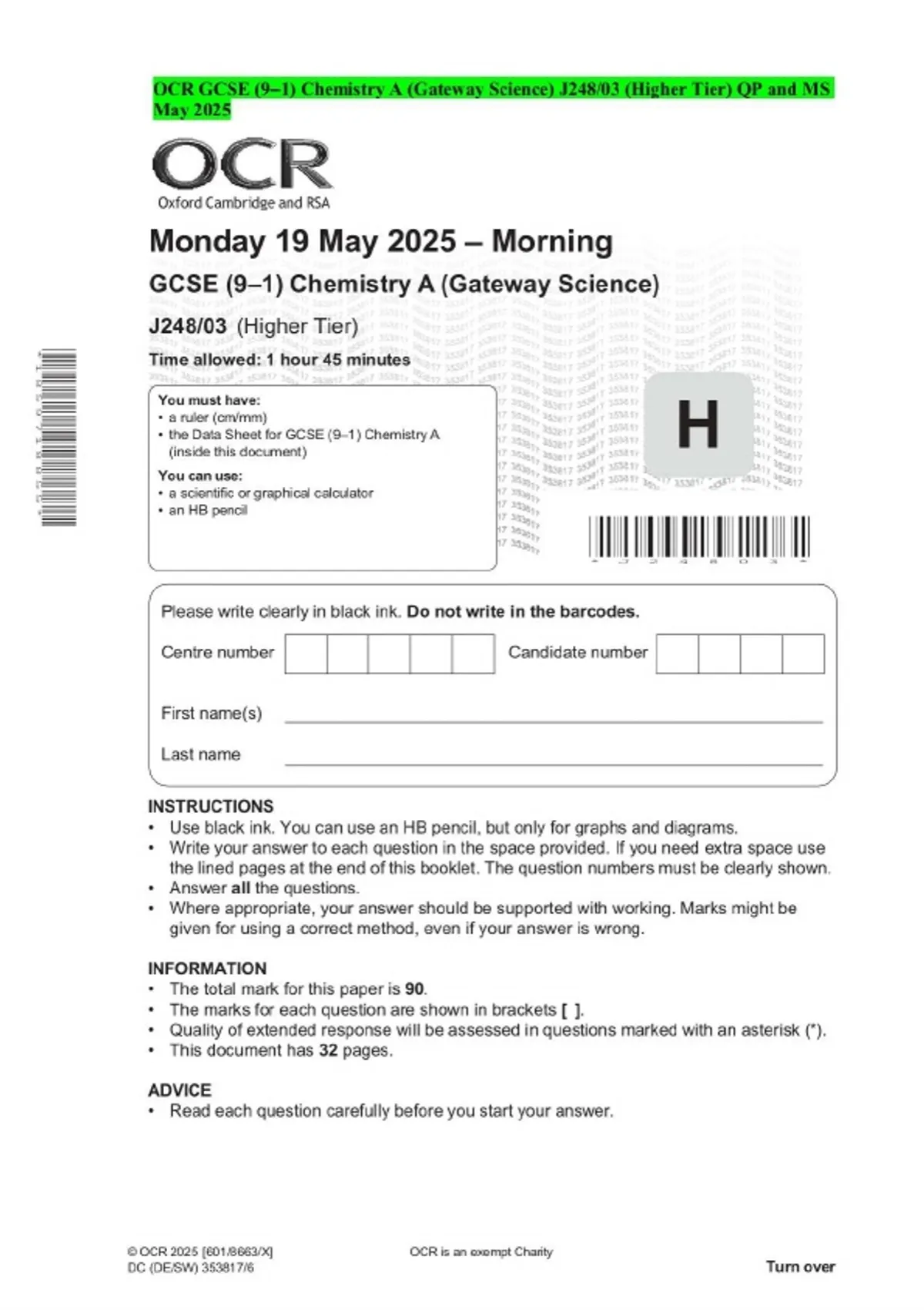 OCR GCSE (9–1) Chemistry A (Gateway Science) J248/03 (Higher Tier) QP and MS May 2025