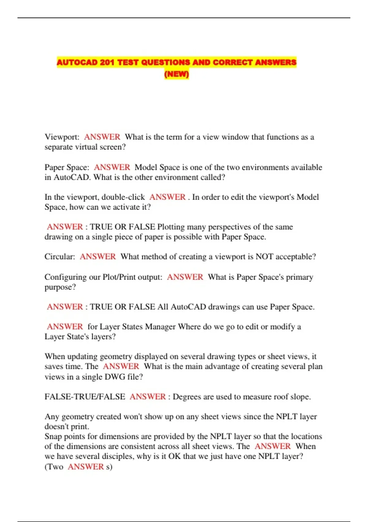 AUTOCAD 201 TEST QUESTIONS AND CORRECT ANSWERS (NEW)