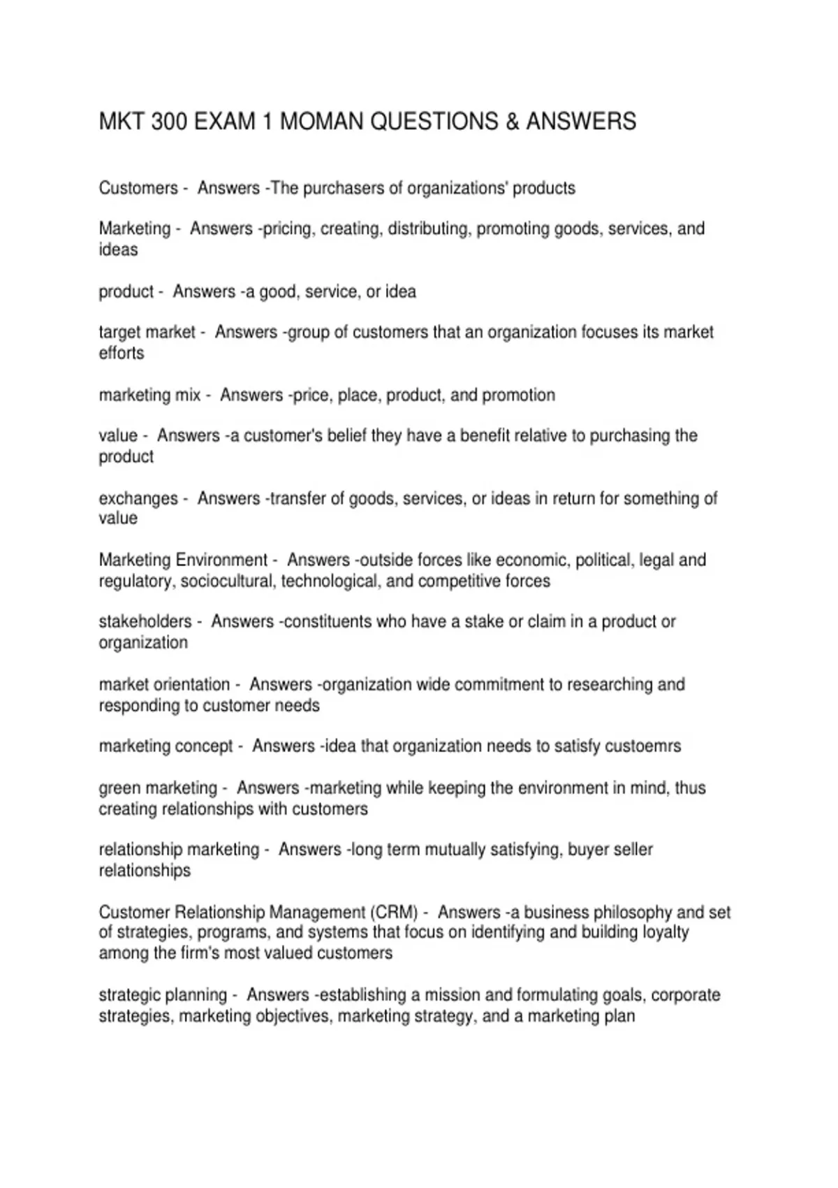 MKT 300 EXAM 1 MOMAN QUESTIONS & ANSWERS