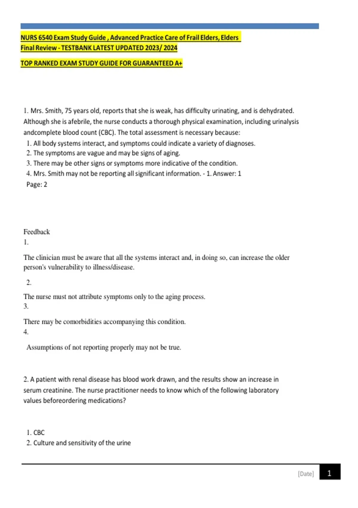 The NURS 6540 Exam Study Guide: Advanced Practice Care of Frail Elders is a fully updated 2023/2024 test bank designed for graduate nursing students specializing in geriatric and advanced practice care. This comprehensive resource focuses on the assessment, management, and evidence-based care of frail older adults, providing a structured approach to mastering the content needed for exams and clinical application. The test bank includes multiple-choice questions, scenario-based questions, and case studies covering topics such as frailty assessment, chronic disease management, polypharmacy, functional decline, ethical decision-making, patient safety, and interprofessional collaboration. Each question comes with detailed answers and explanations to reinforce understanding, improve clinical judgment, and strengthen critical thinking skills. Ideal for final review, self-study, and exam preparation, this test bank ensures students are fully prepared for course assessments and practical application in advanced geriatric care. It is especially useful for NURS 6540 students aiming for mastery in caring for frail elders in clinical, community, and long-term care settings.
