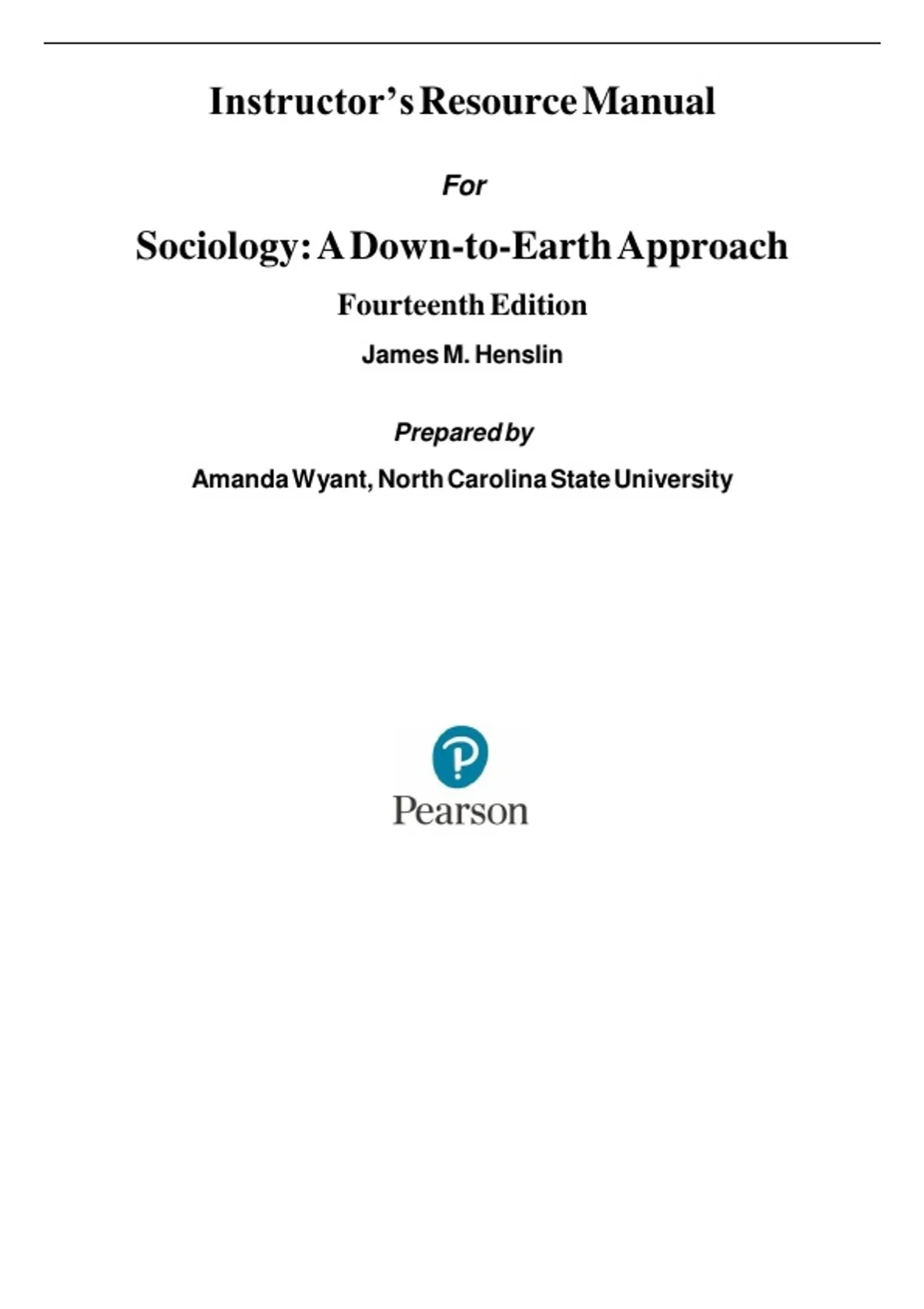The Instructor’s Resource Manual for Sociology: A Down-to-Earth Approach, 14th Edition is a comprehensive teaching and exam-preparation resource designed to support instructors in delivering effective sociology courses. Authored by James M. Henslin and prepared by Amanda Wyant of North Carolina State University, this manual aligns with the widely used textbook to provide guidance on course planning, content delivery, and student assessment. The resource includes chapter summaries, discussion questions, lecture outlines, sample test questions, and instructional strategies that make sociology concepts accessible and engaging for students. Topics covered span social institutions, culture, deviance, socialization, inequality, race and ethnicity, gender, family, education, and global issues, reflecting both classic and contemporary sociological perspectives. Ideal for faculty and teaching assistants, this manual helps streamline lesson planning, generate assessments, and create interactive learning experiences. It is especially valuable for structuring exams, quizzes, and assignments that reflect the textbook’s content while fostering critical thinking and student engagement in sociology.